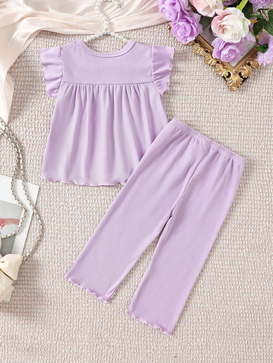 مجموعة ملابس علوية بأكمام قصيرة ربطة مخرمة وبنطال طويل