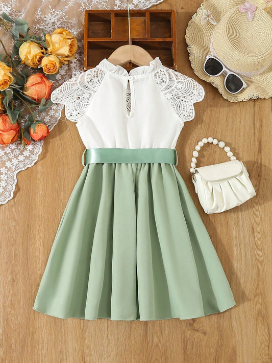 فستان بأكمام طبقات متداخلة وشبكة متباينة لفتاة صغيرة