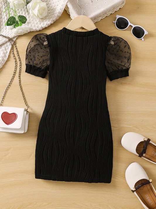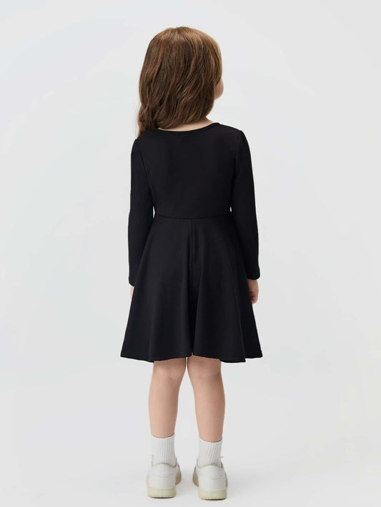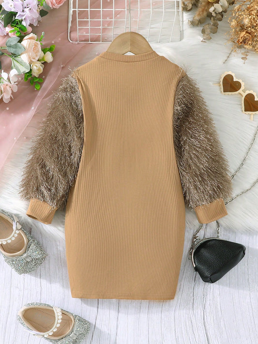 فستان زغبي اكمام محبوك مضلع بنت طفل