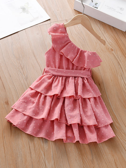 فستان بحزام منقط سويسري كتف واحد حافة طبقات للبنات الصغار