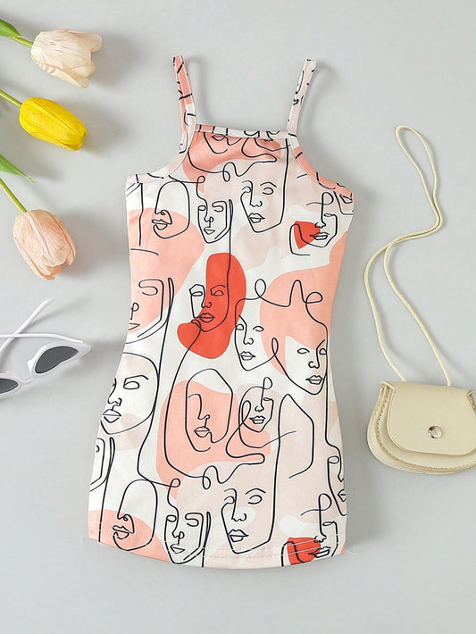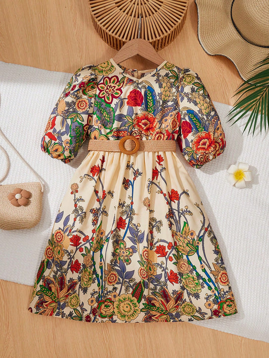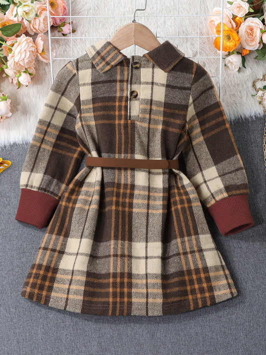 فستان بحزام طباعة مربع النقش للبنات الصغار