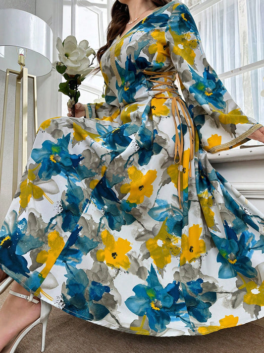 فستان زهور بلس مطبوع متضارب مع دانتيل