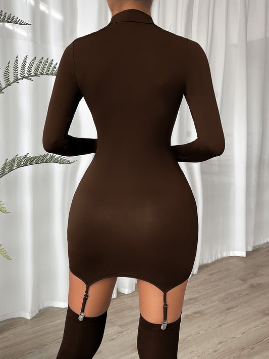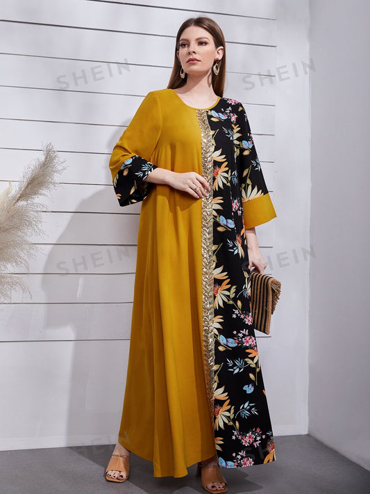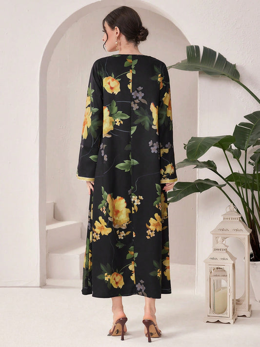 فستان نسائي بطبعة زهور عنق V وأكمام طويلة