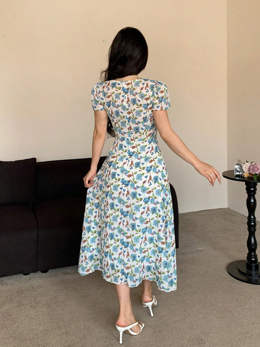 فستان طباعة الأزهار خط عنق مفتوح جيب مخفي