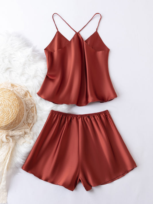 طقم بيجامة شورت مع لباس علوي بحمالات ساتان