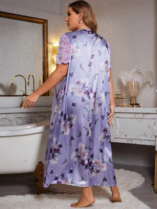 قميص نوم مع روب منزلي مقاس كبير رسم الزهر كاجوال