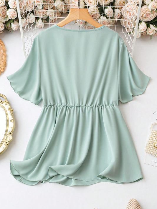 بلوزة موحدة اللون صدور متداخل أكمام فانوس