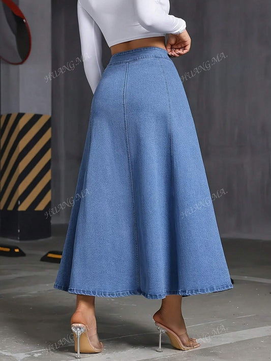 تنورة جينز طويلة وأنيقة بخصر عالٍ وأكمام وحيدة للنساء