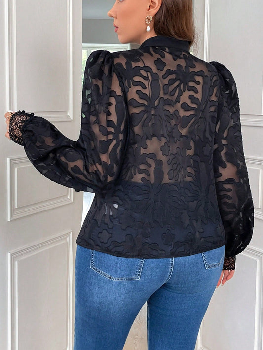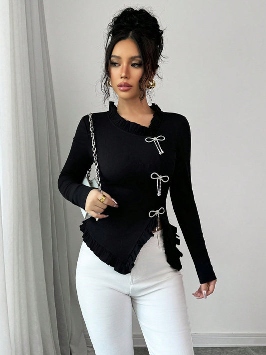 تي شيرت أنيقة للنساء بأكمام طويلة ومرصعة بالماس والفيونكة
