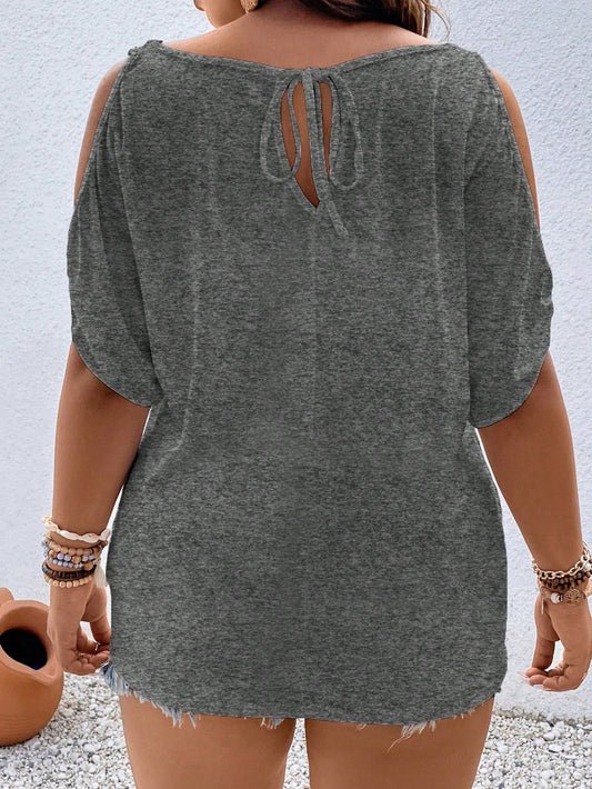 تي شيرت كاجوال بأكتاف مكشوفة ذو لون أحادي مقاس كبير