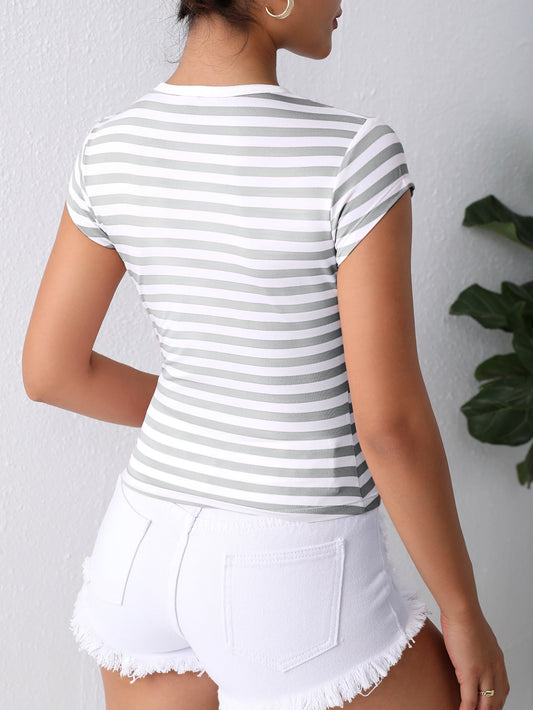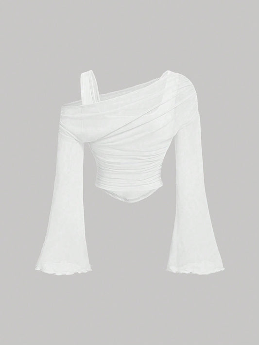 تي شيرت نسائي قصير الأكمام بفتحة كتف مكشوفة وربطة