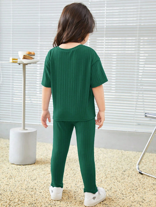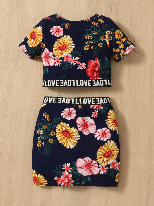 تي شيرت وتنورة برسومات زهور وكتابة للفتاة الصغيرة