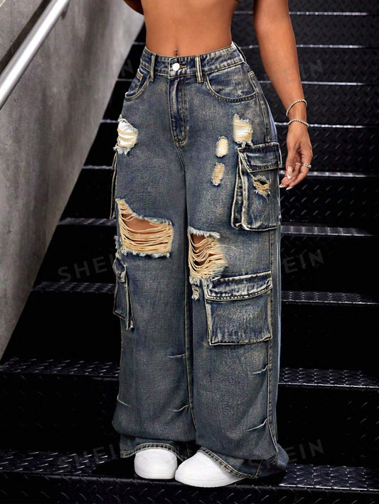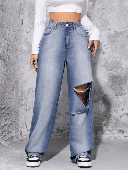 جينز ممزق عالي الخصر وواسع الساق