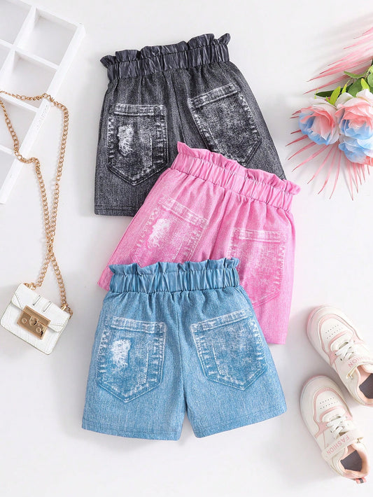 شورت طبعة زهور بنمط جينز لفتاة صغيرة، 3 قطع/عبوة