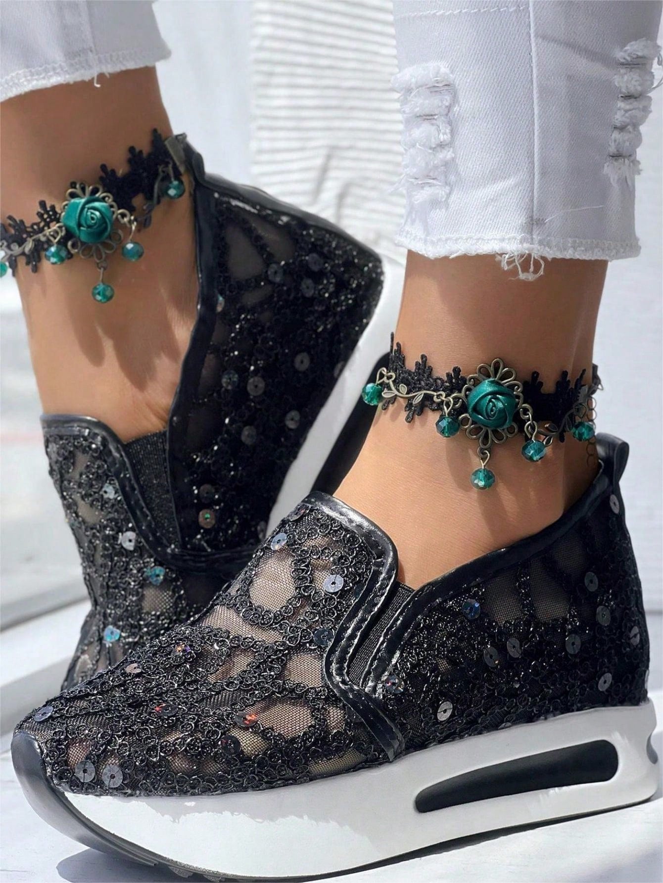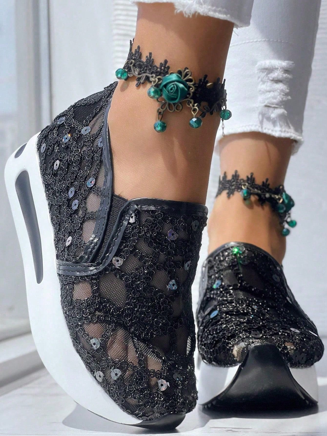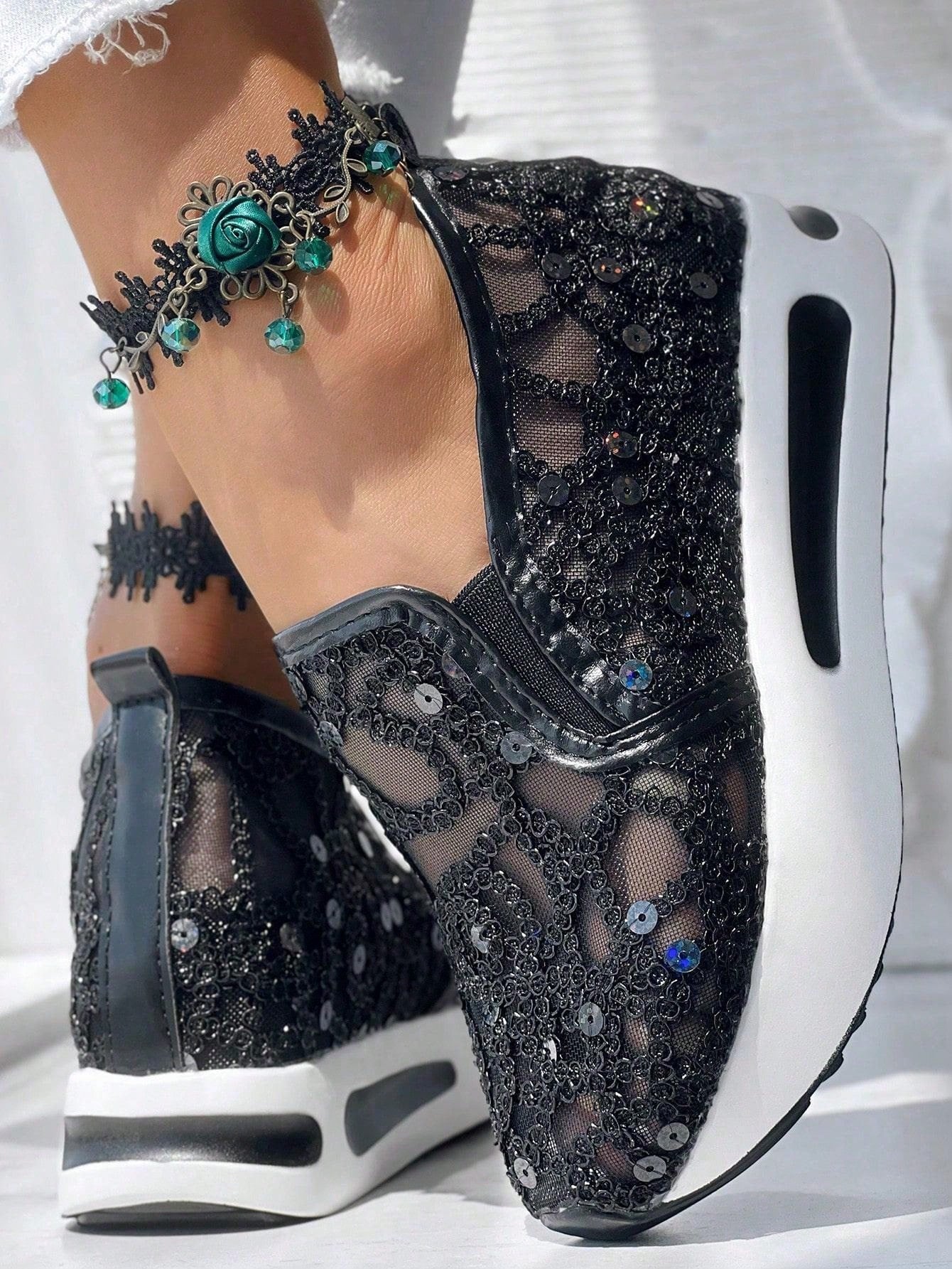 أحذية كاجوال نسائية ذات كعب منصة ويدج من شبكة براقة، أحذية حفلات وحفلات زفاف، عودة إلى المدرسة، جديد خريف/شتاء أسود معدني