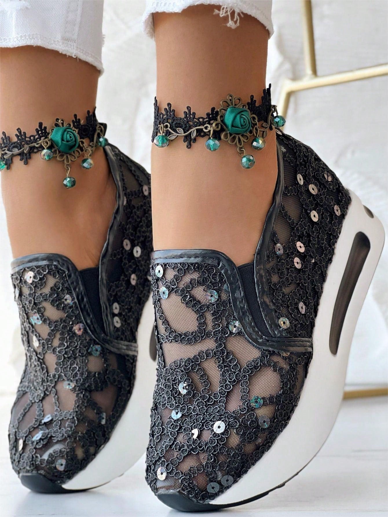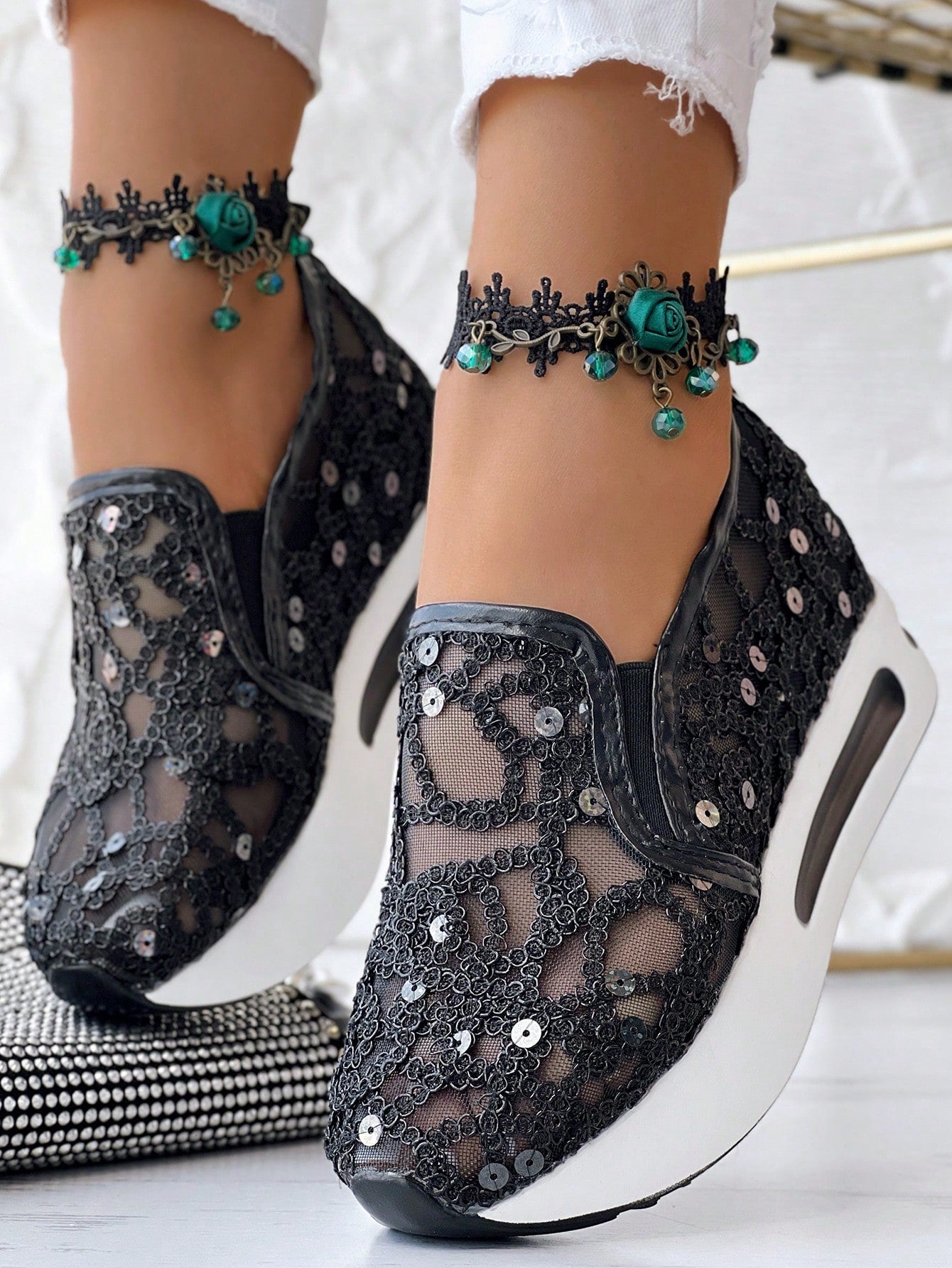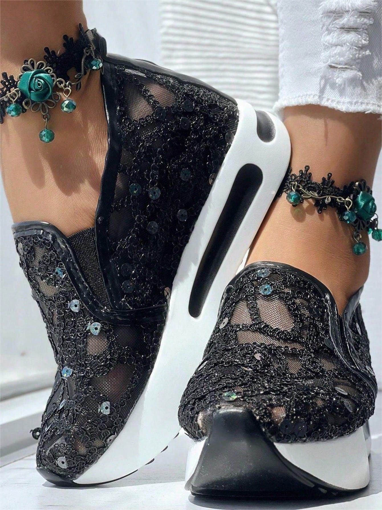 أحذية كاجوال نسائية ذات كعب منصة ويدج من شبكة براقة، أحذية حفلات وحفلات زفاف، عودة إلى المدرسة، جديد خريف/شتاء أسود معدني