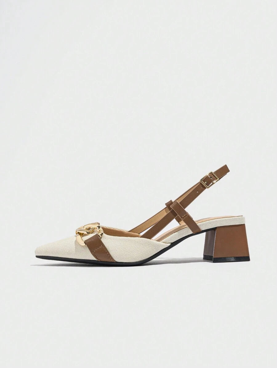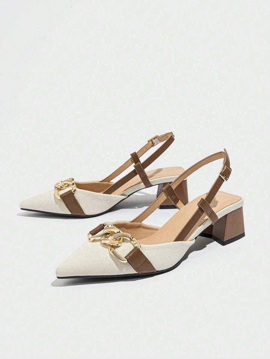أحذية كعب سميك ذات لون أحادي وأصبع مدبب مغلق مع زخارف سلسلة للنساء