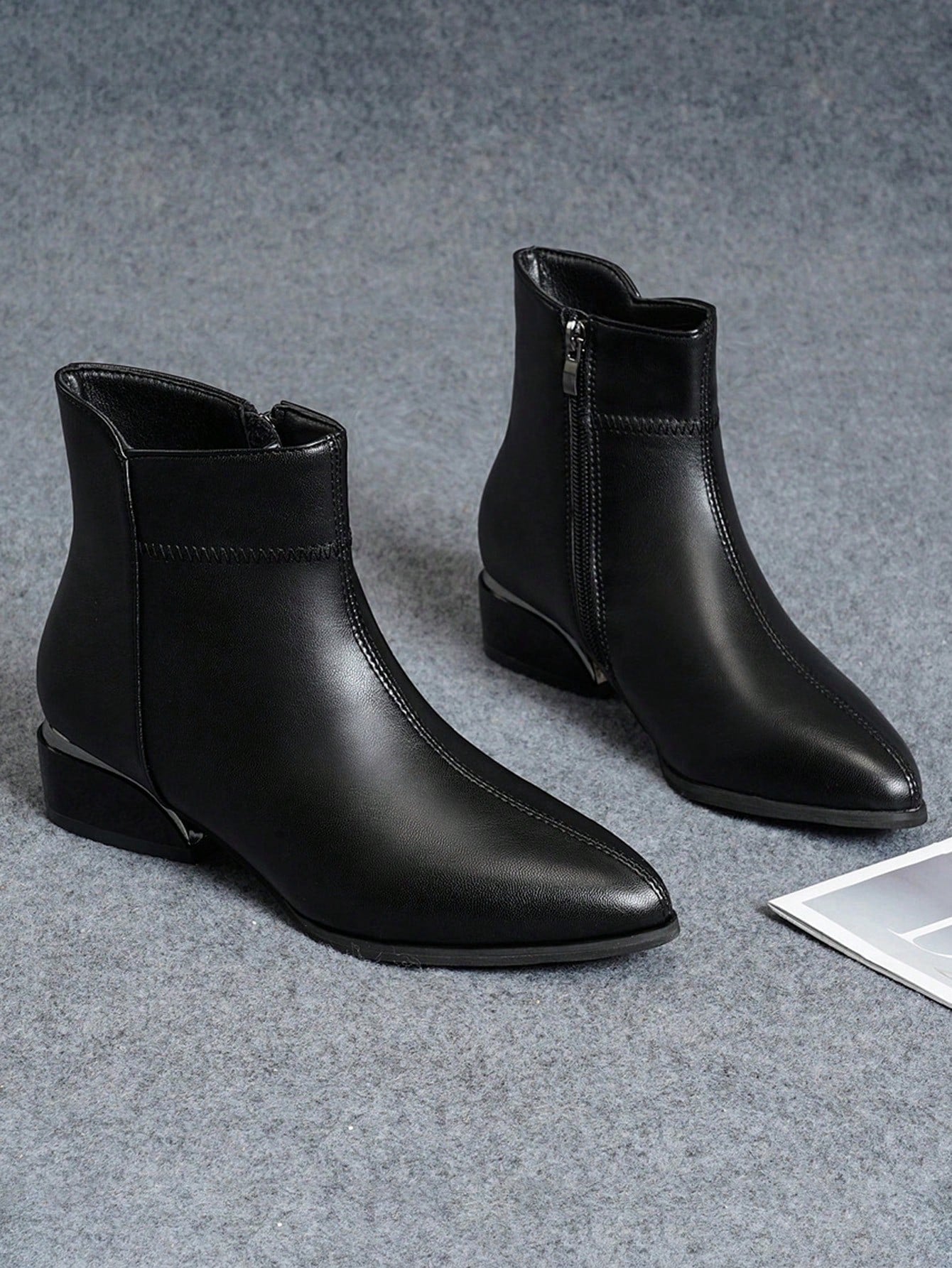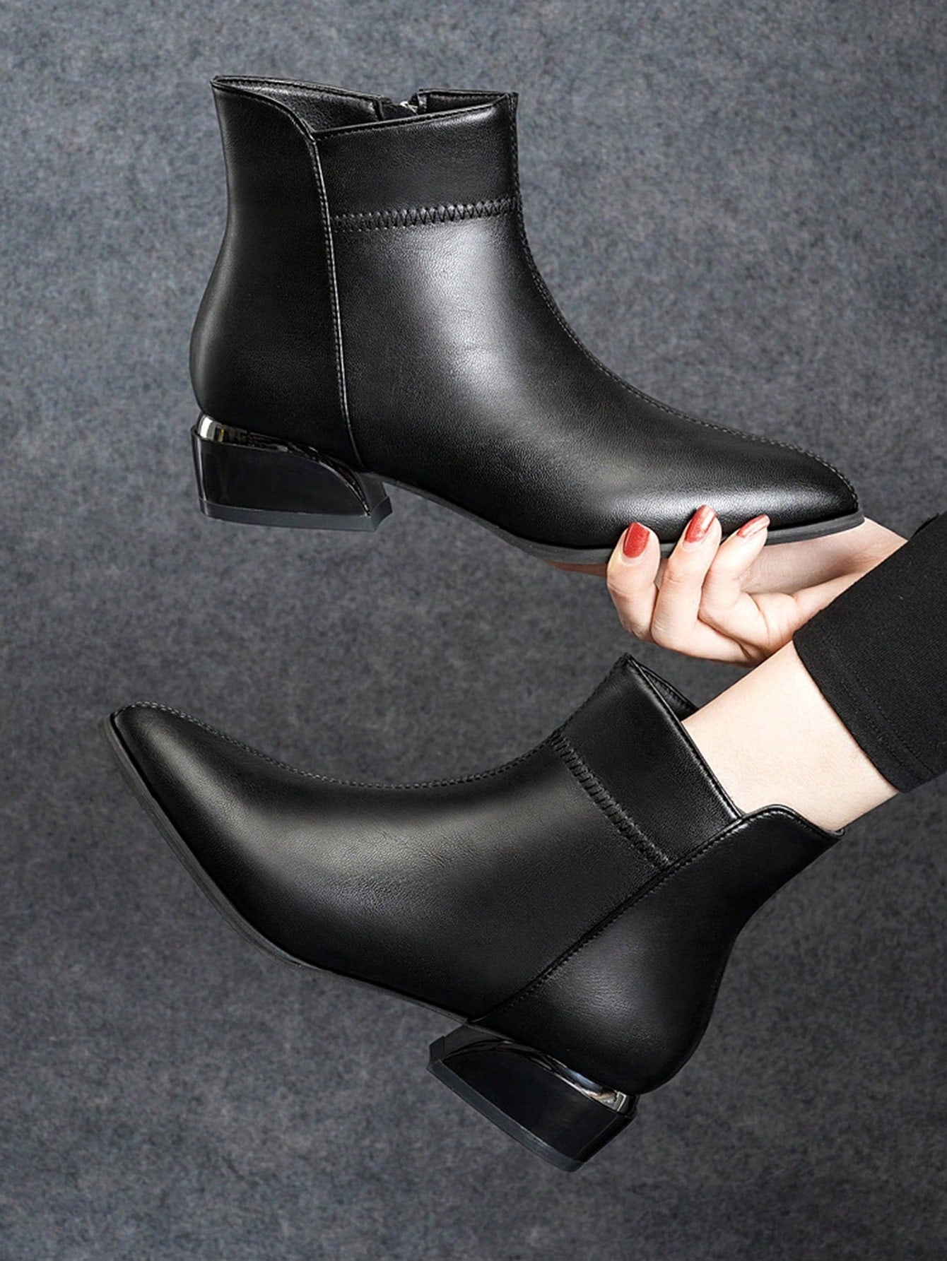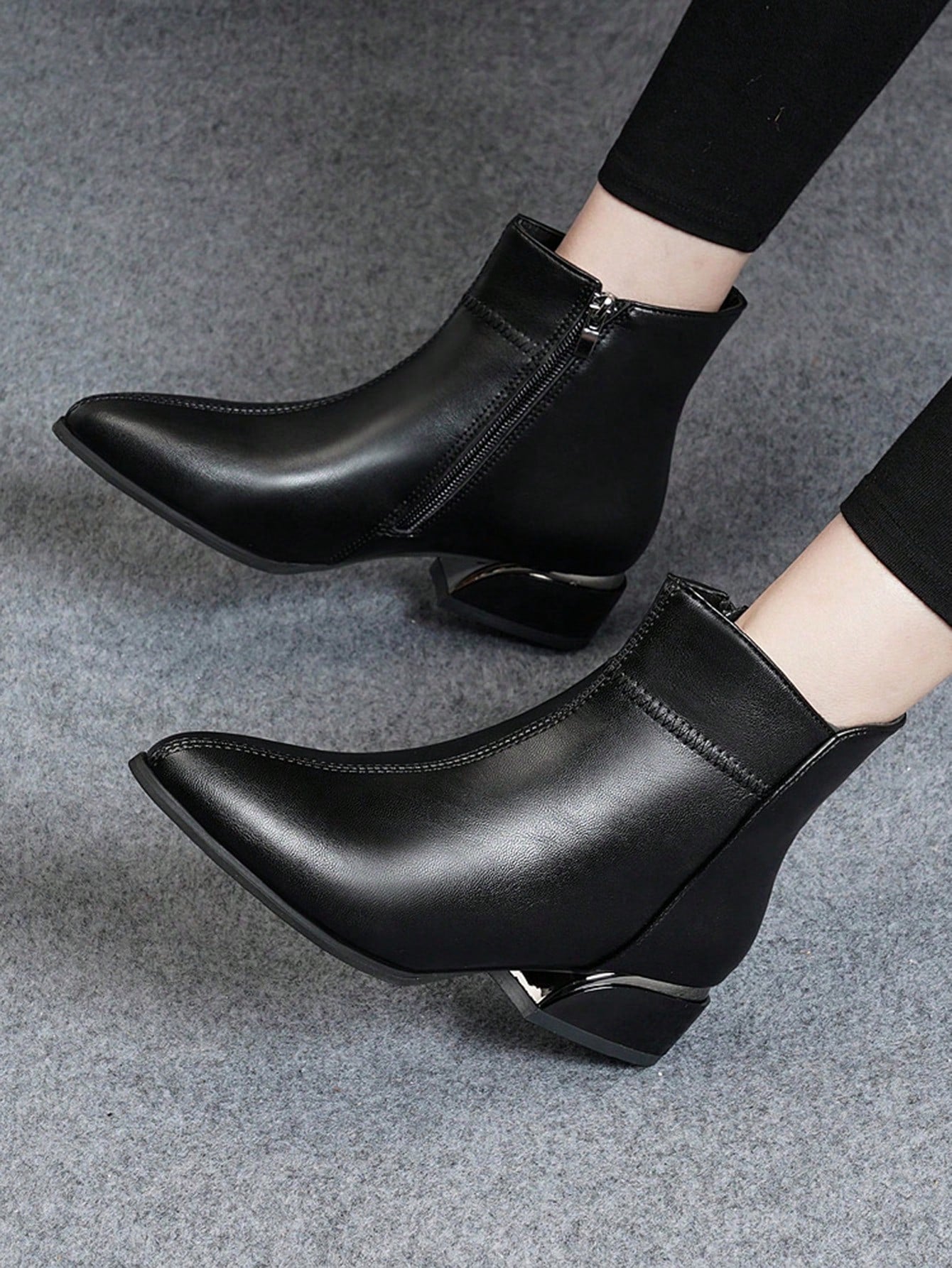 أحذية كلاسيكية سحاب جانبي باصابع قدم مدبب حذاء كعب مكتنز أنيق أسود خارجي نساء