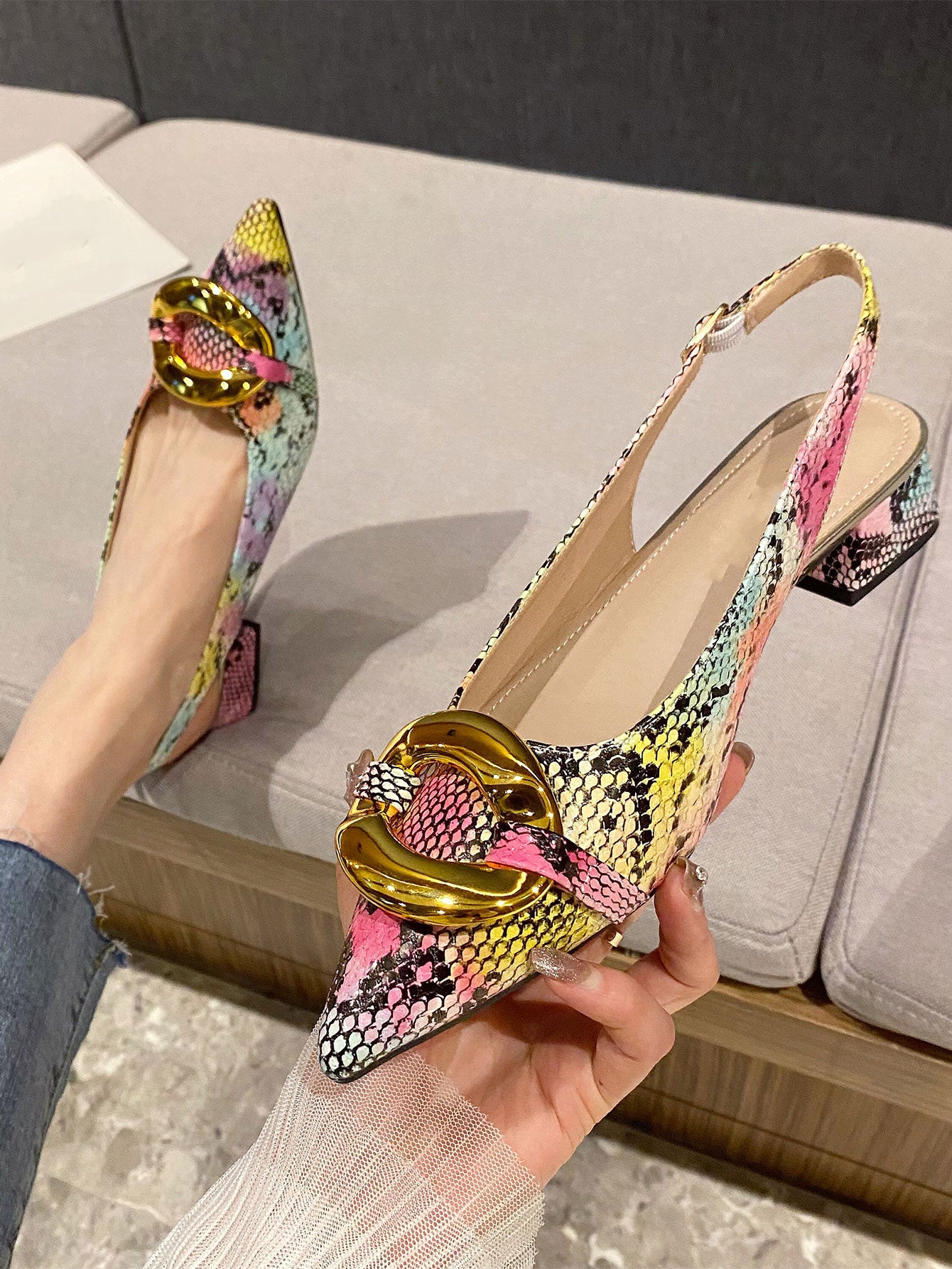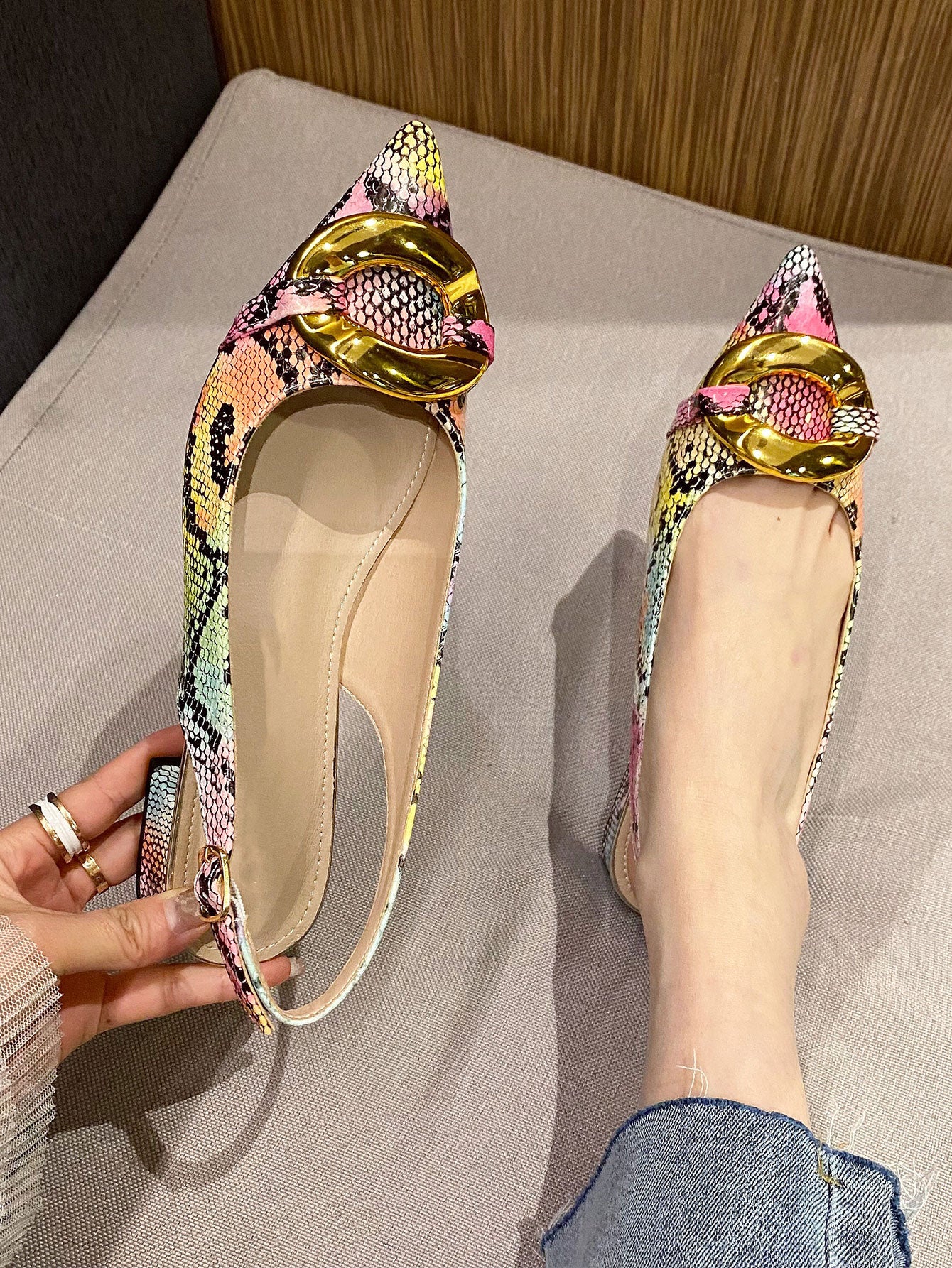 أحذية مسطحة بتطريز جلود الثعبان الاصطناعي بديكور معدني باصابع قدم مدبب مفتوح الوراء جبان خارجي امرأة