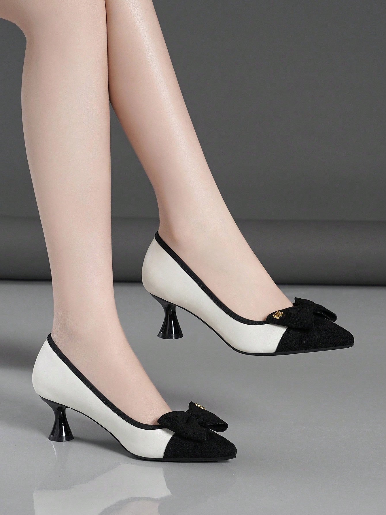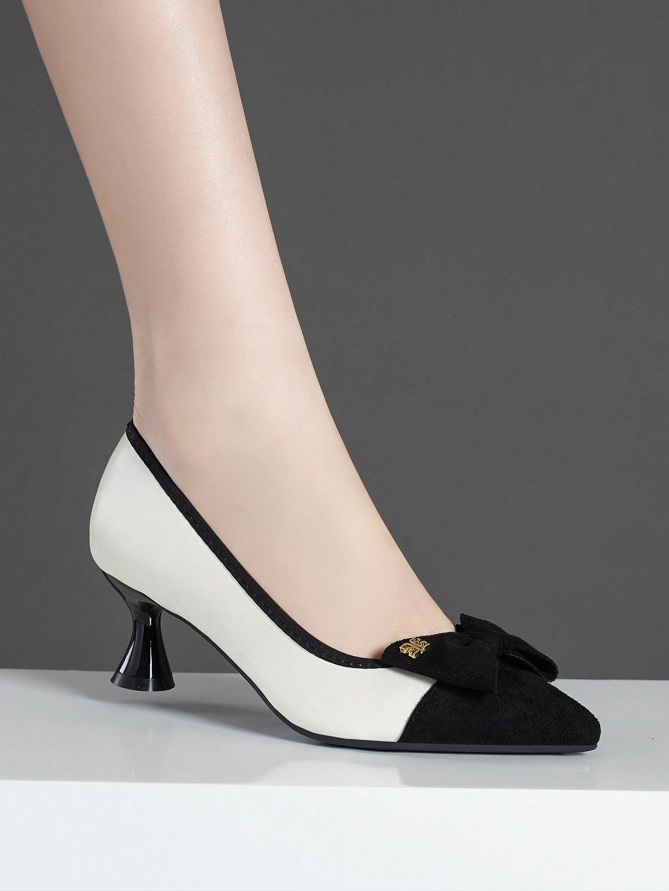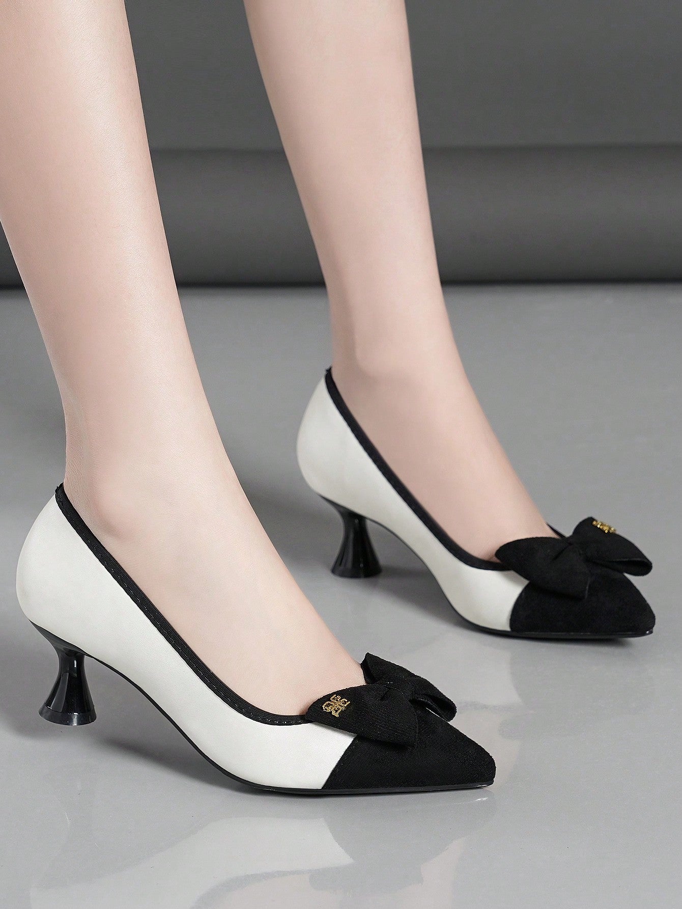 أحذية نسائية ذات كعب عالٍ بمقدمة مدببة ولمسة فيونكة باللون الأبيض والفضي والأسود، موضة جديدة، أحذية نسائية جلدية ذات كعب منخفض