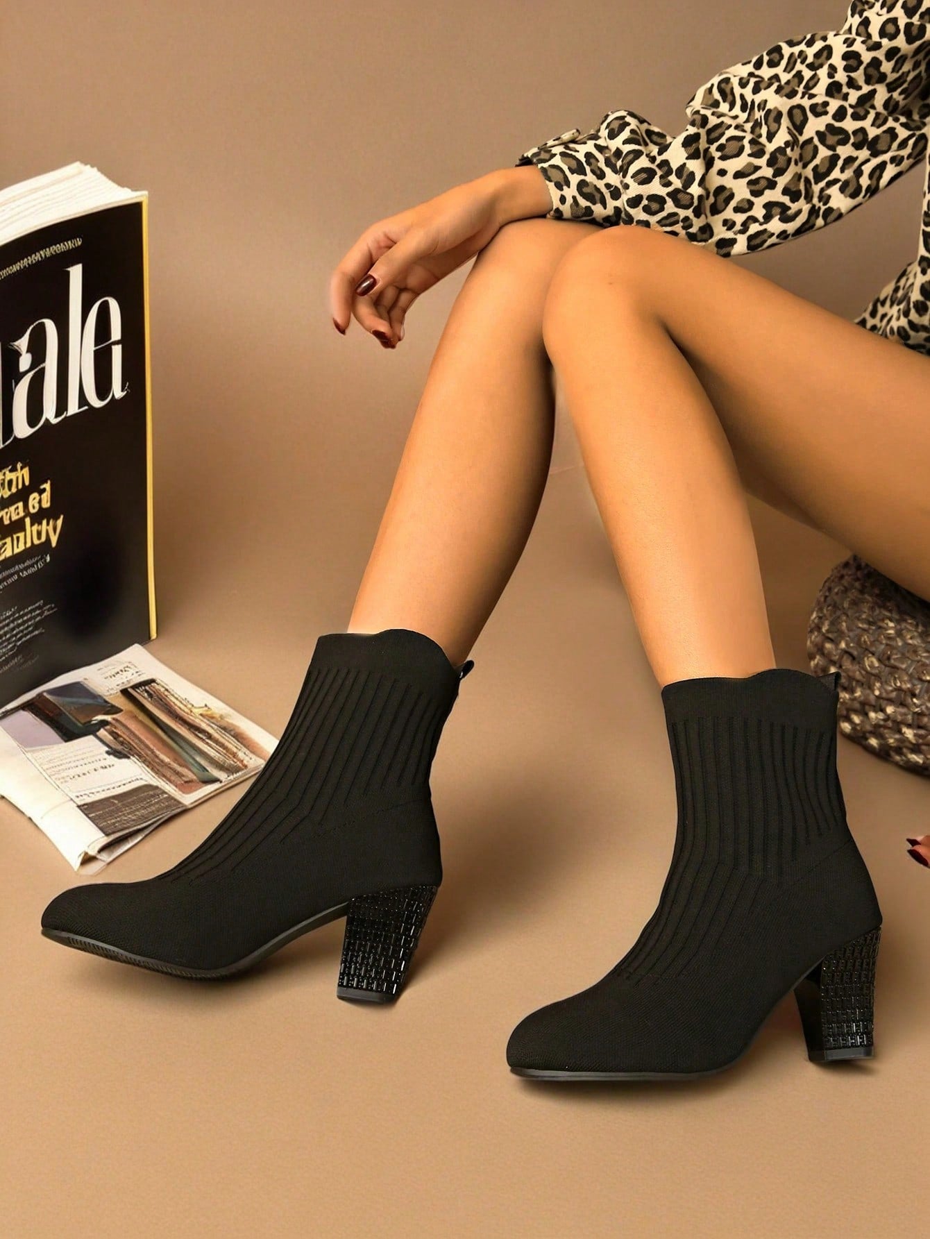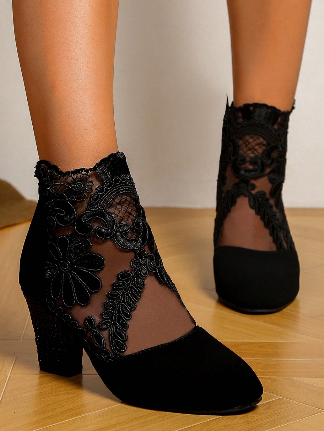 الأحذية الراقية ذات الكعب العالي المربع والطرف المدبب، من الشبك الأسود المنفذ للهواء، طراز خريفي وشتوي أنيق