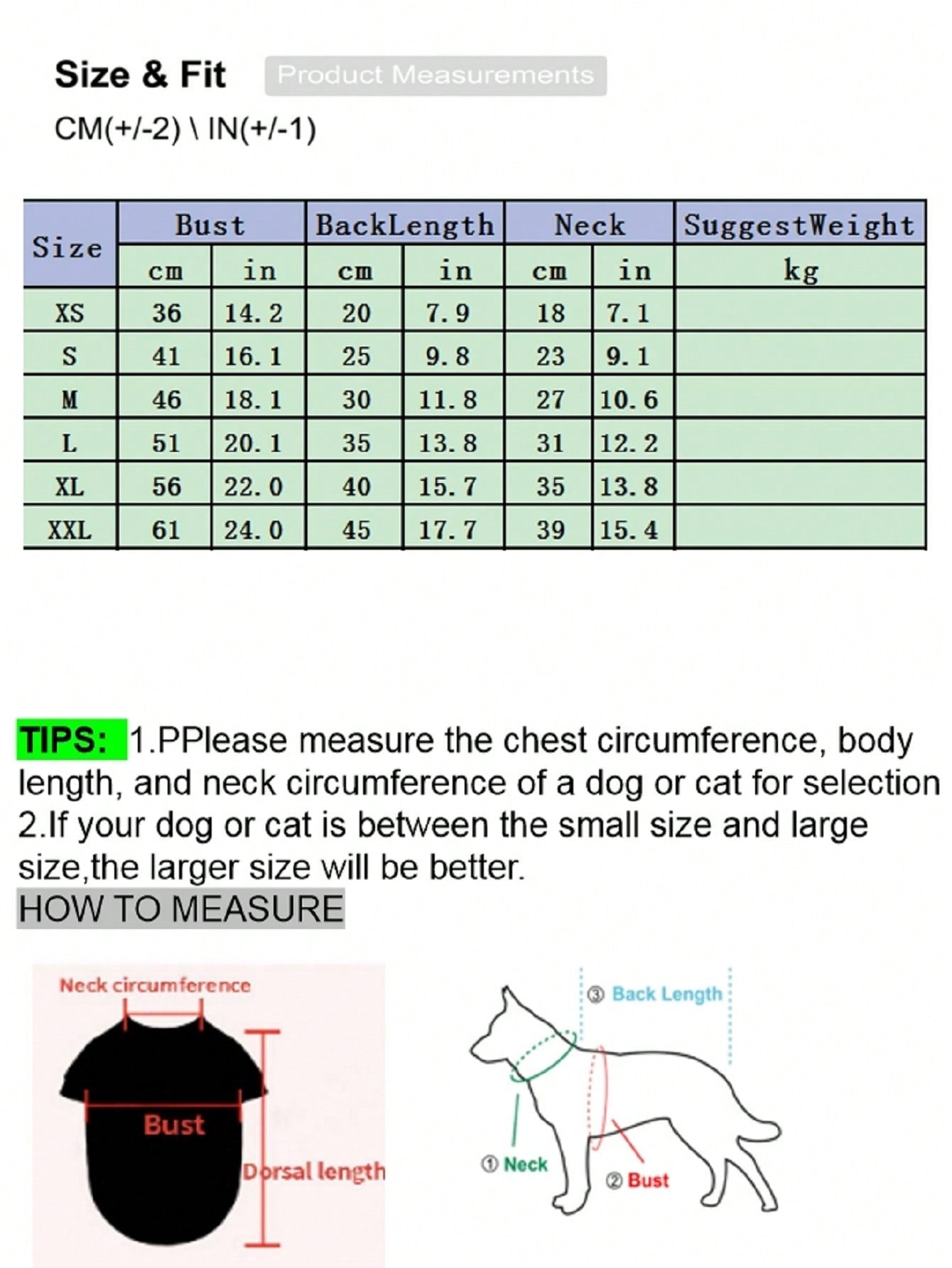 | Size | Back Length | Bust | Neck |