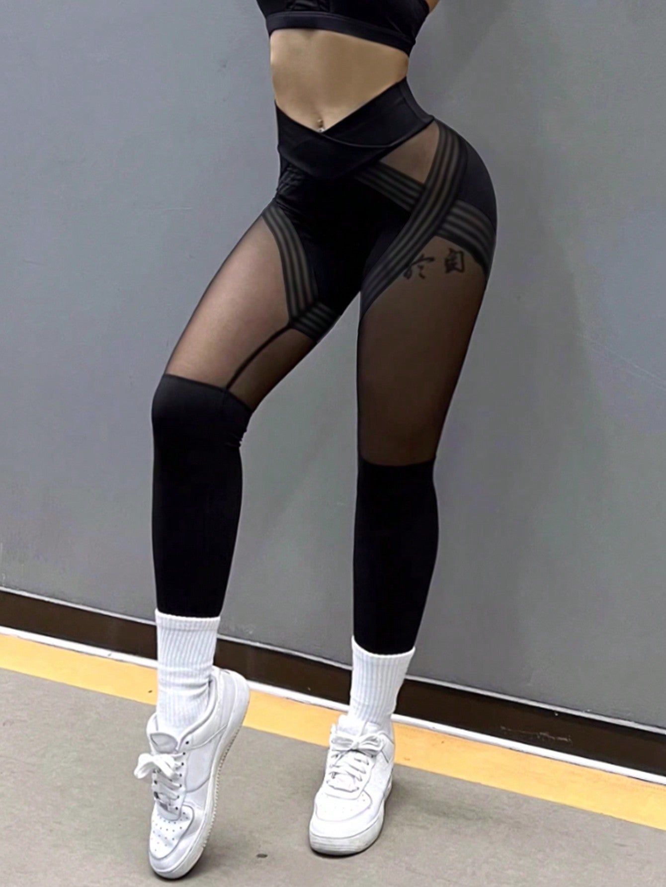 السراويل الضيقة الرياضية للنساء ذات الخصر غير المتماثل والقطع الشبكية الملونة موحد اللون