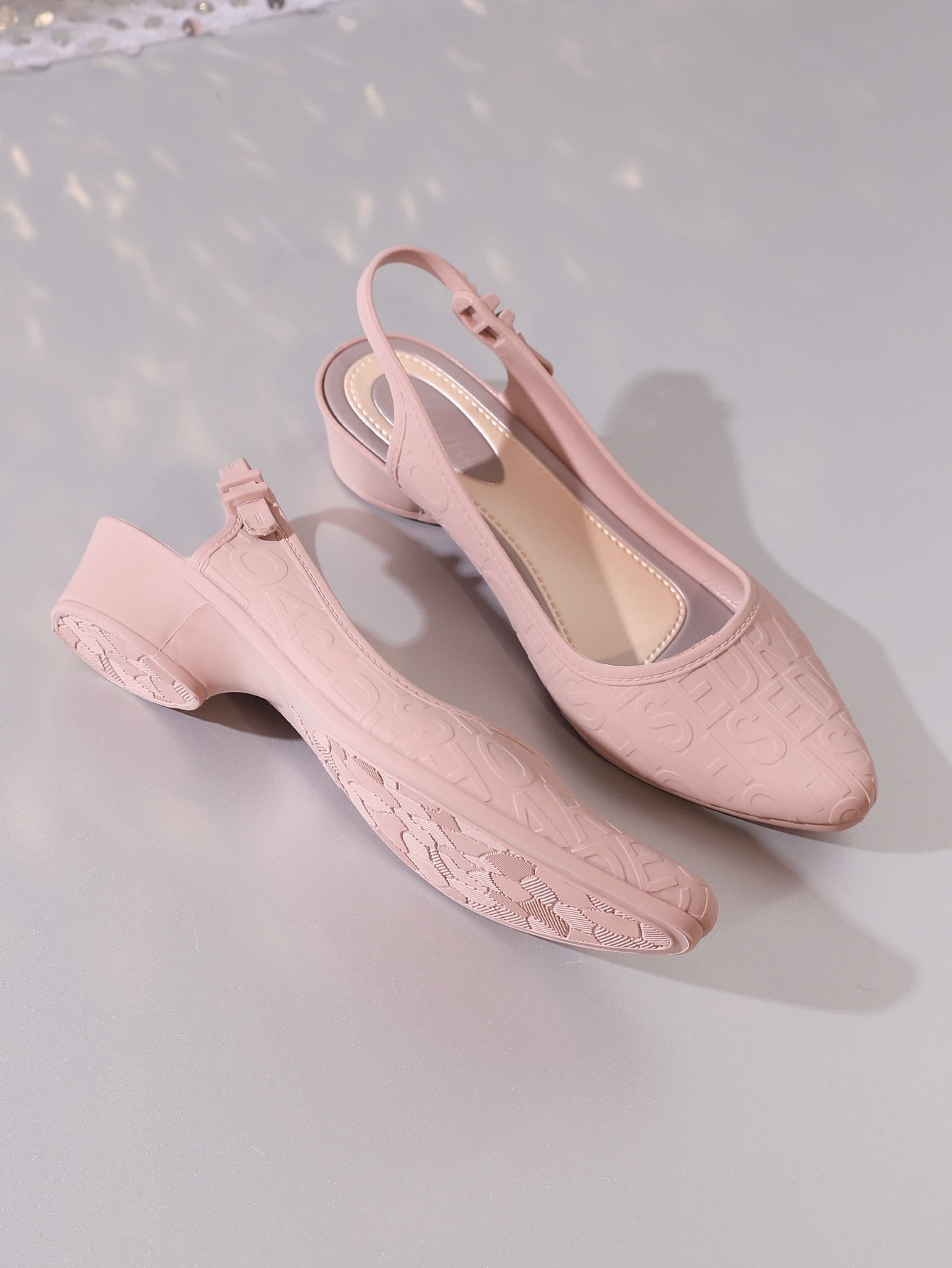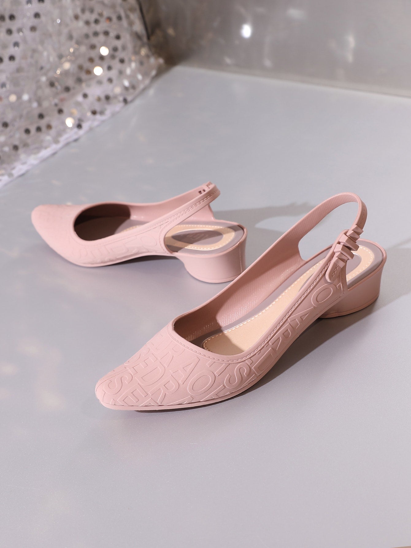 امرأة بطباعة أحرف باصابع قدم مدبب حذء كعب عالي موضة وردي مفتوح الوراء حذء كعب عالي