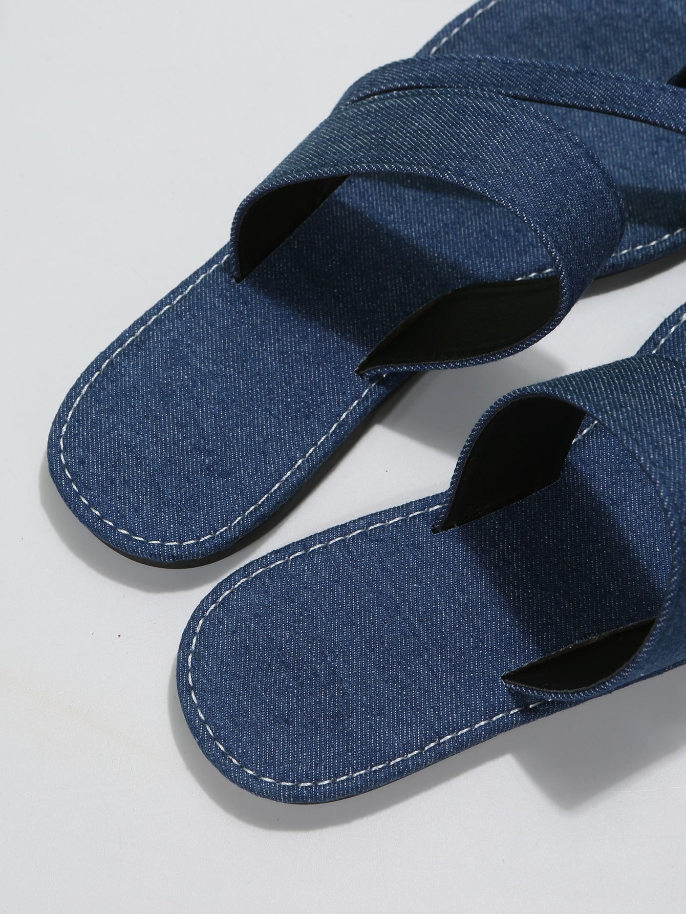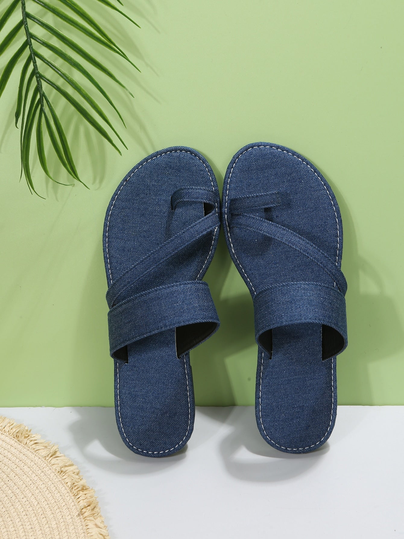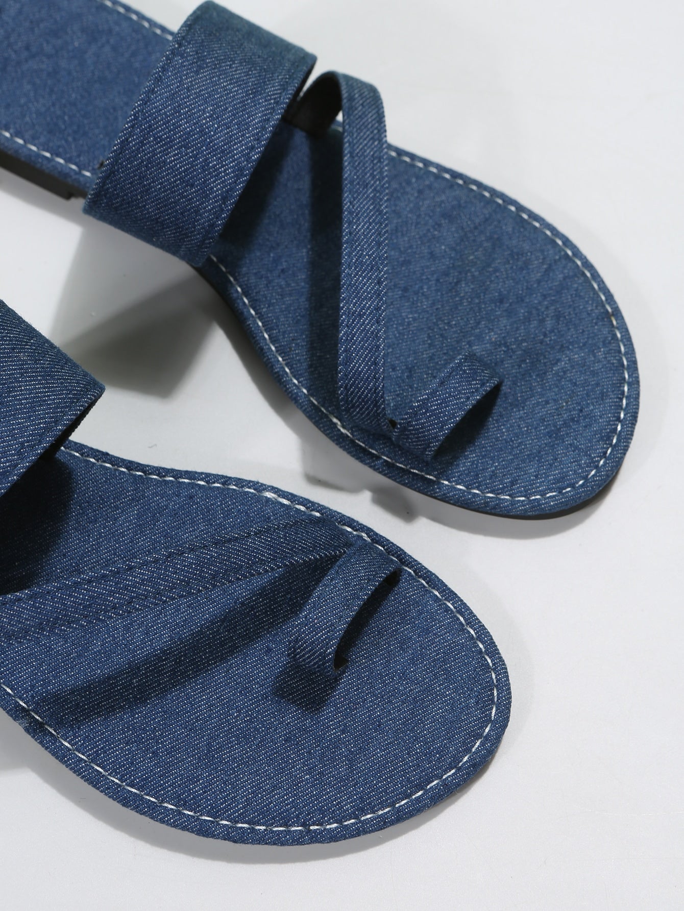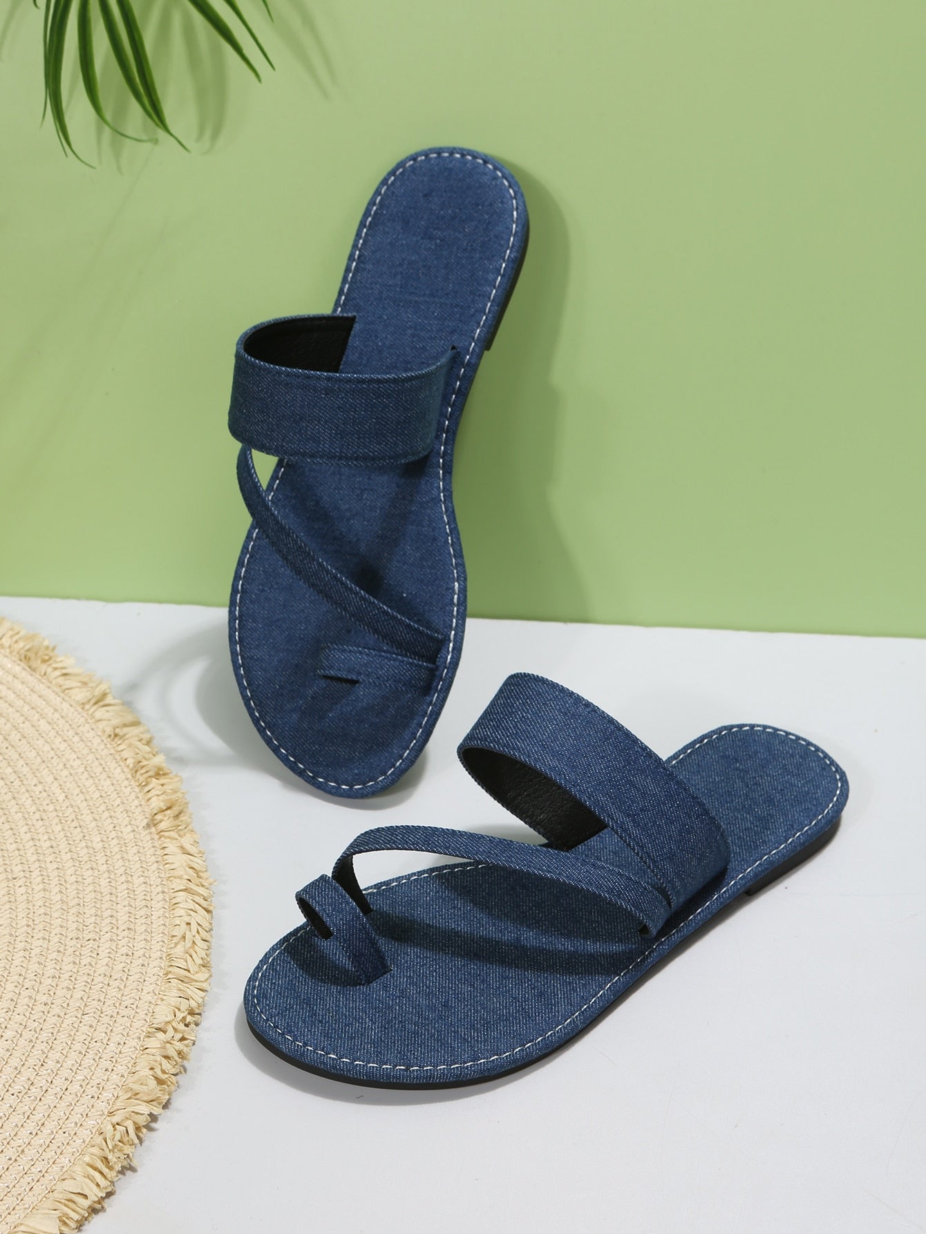 امرأة خاتم اصبع القدم صنادل مسطح خارجي دنيم صنادل بأشرطة رفيعة