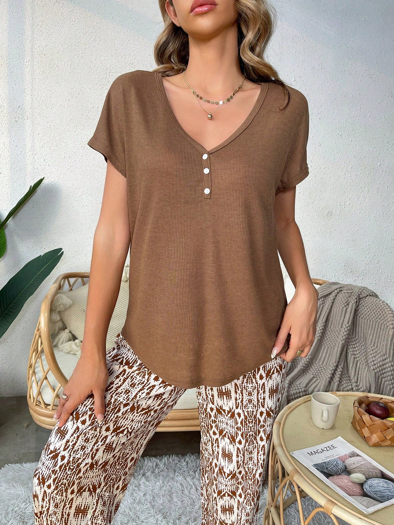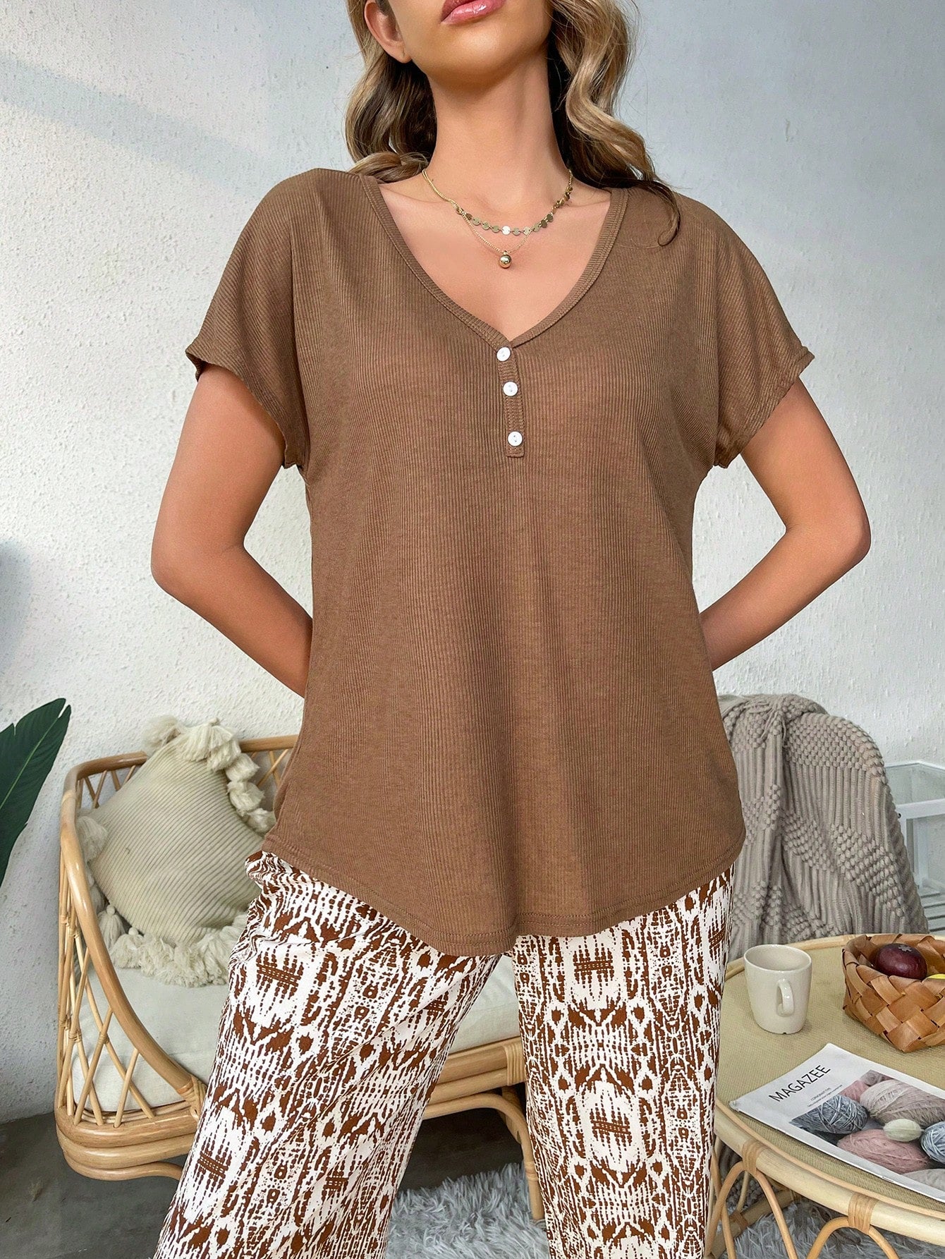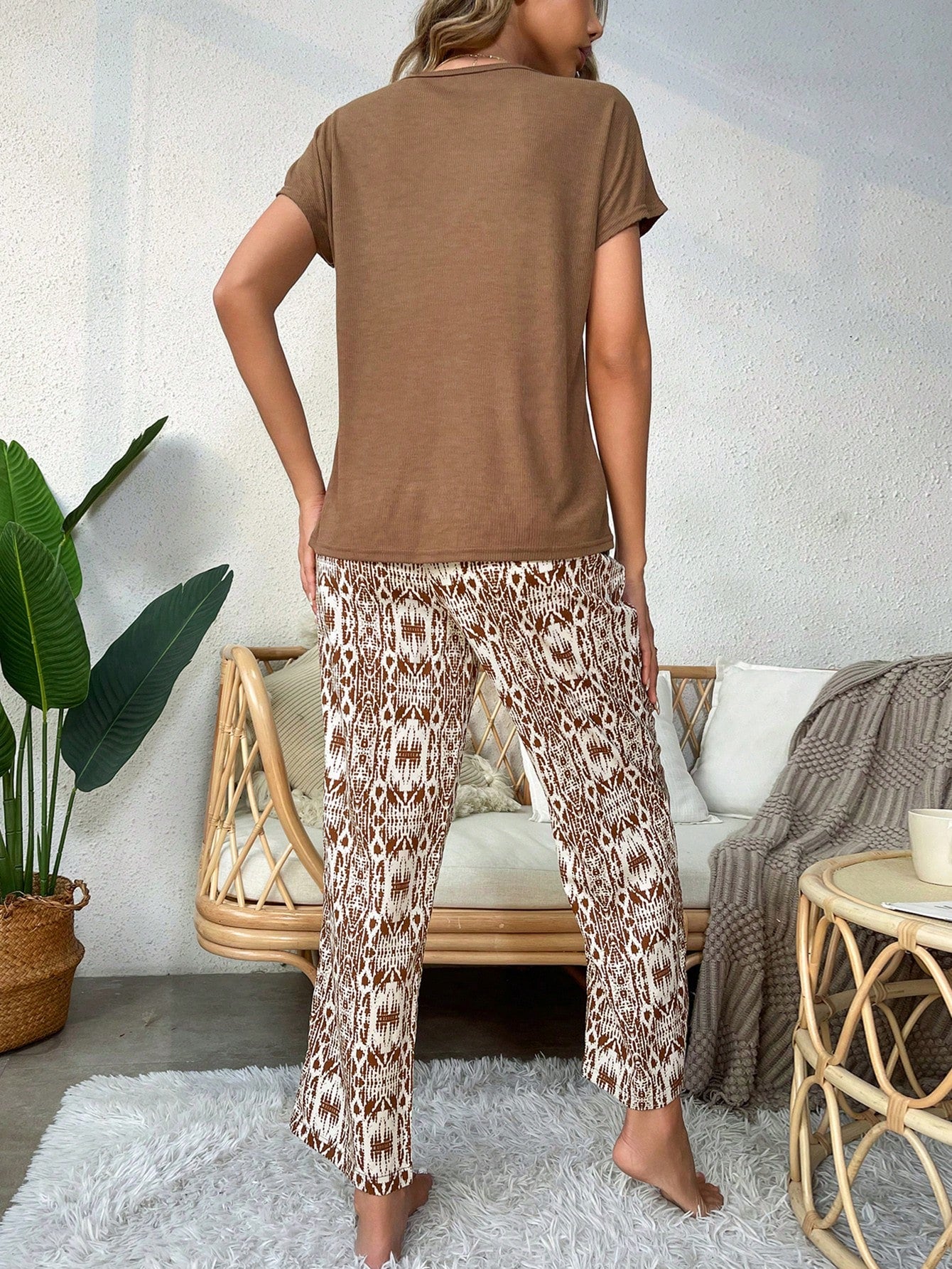بدلة بيجاما مكونة من بلوزة بأكمام خفاش وبنطال بطباعة كاملة