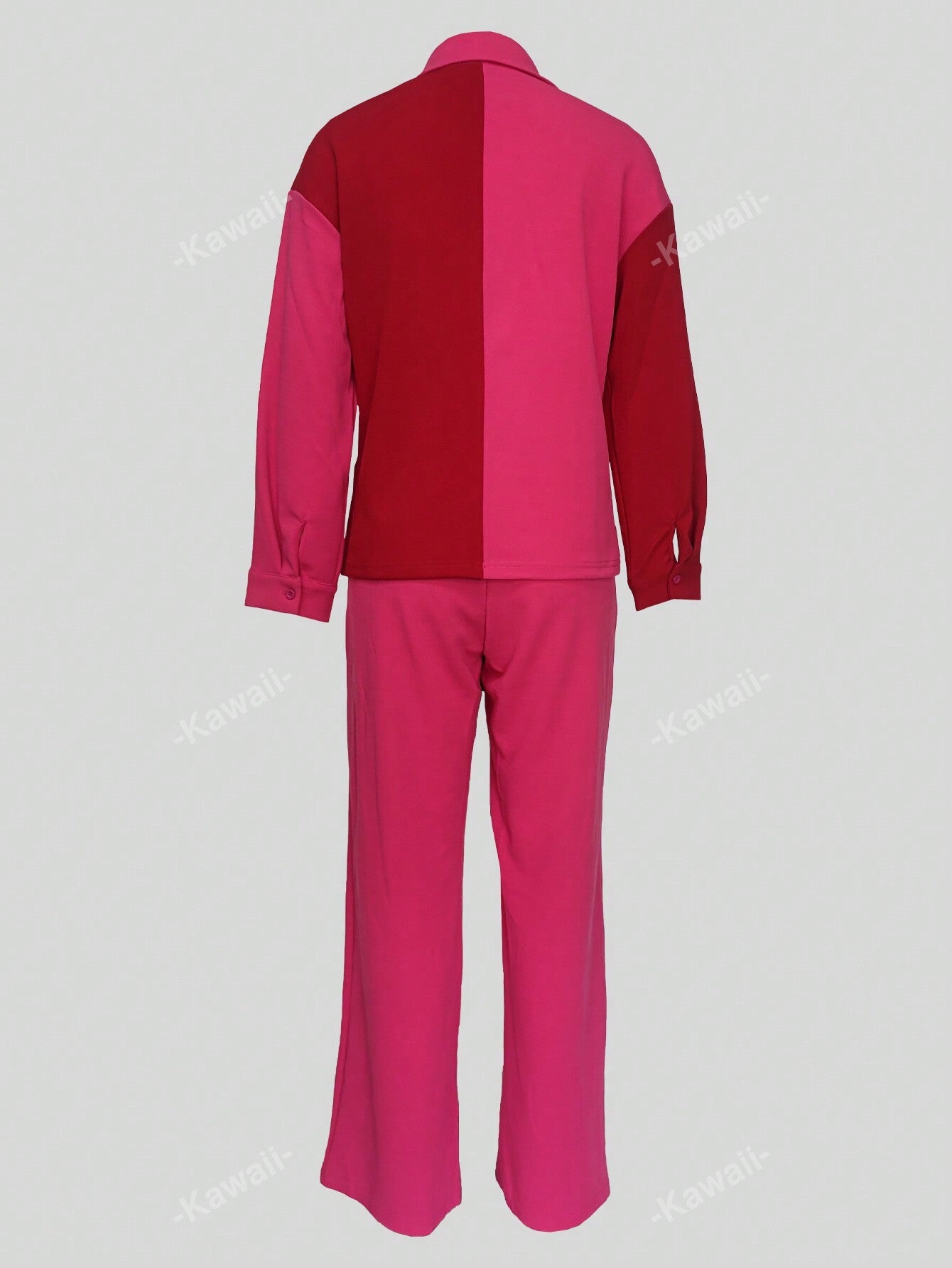 بدلة تتكون من قميص كاجوال أنيق بياقة وألوان متباينة وبنطال بلون واحد قطعتان