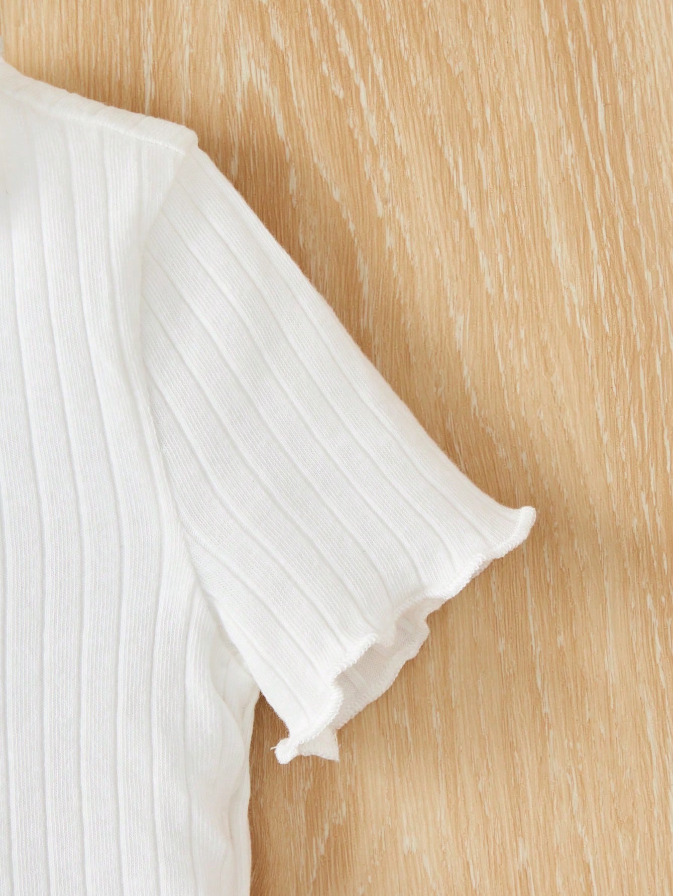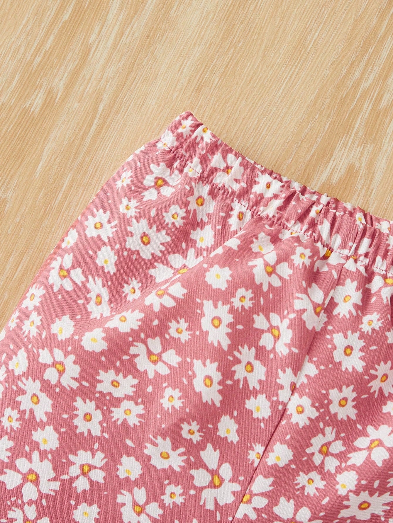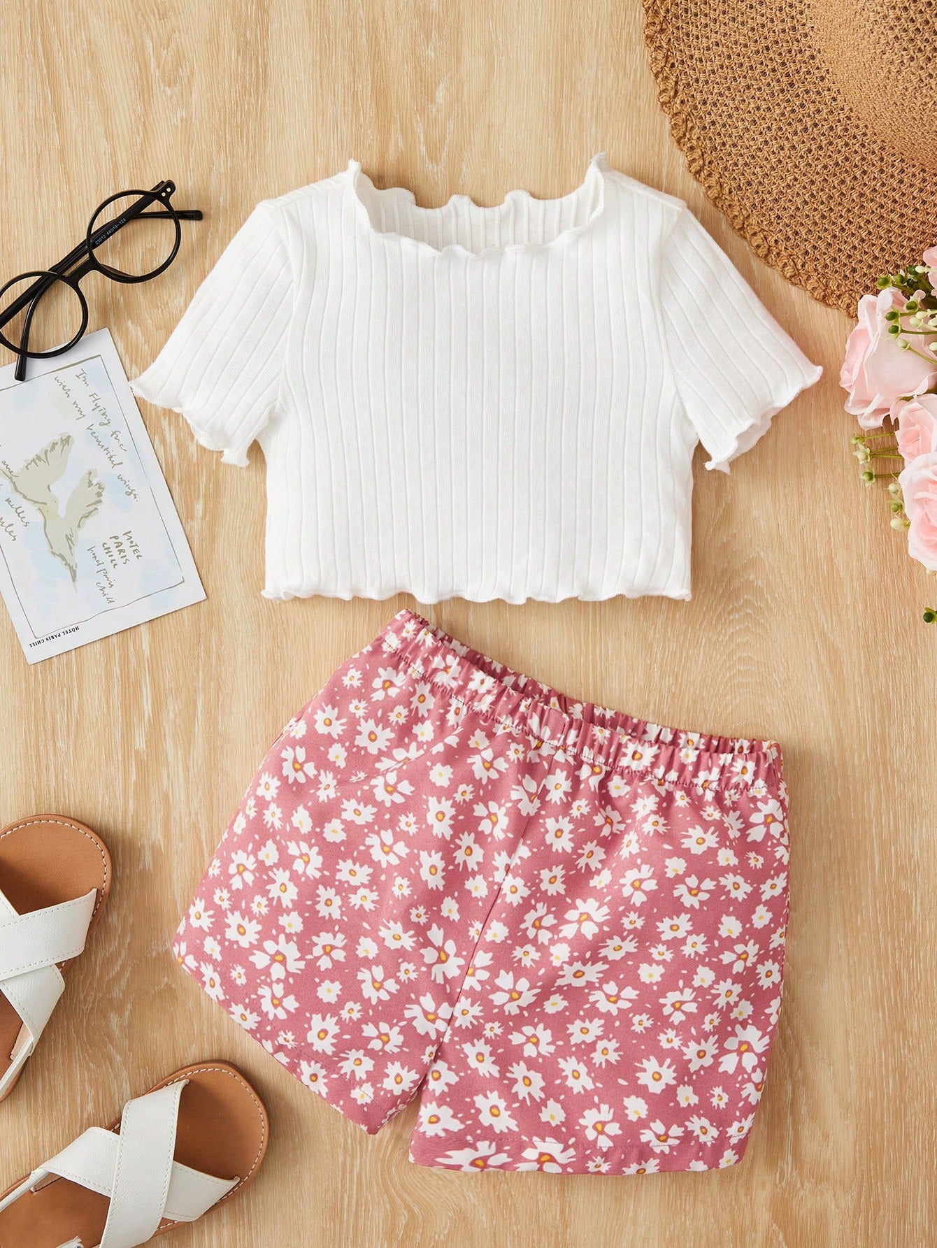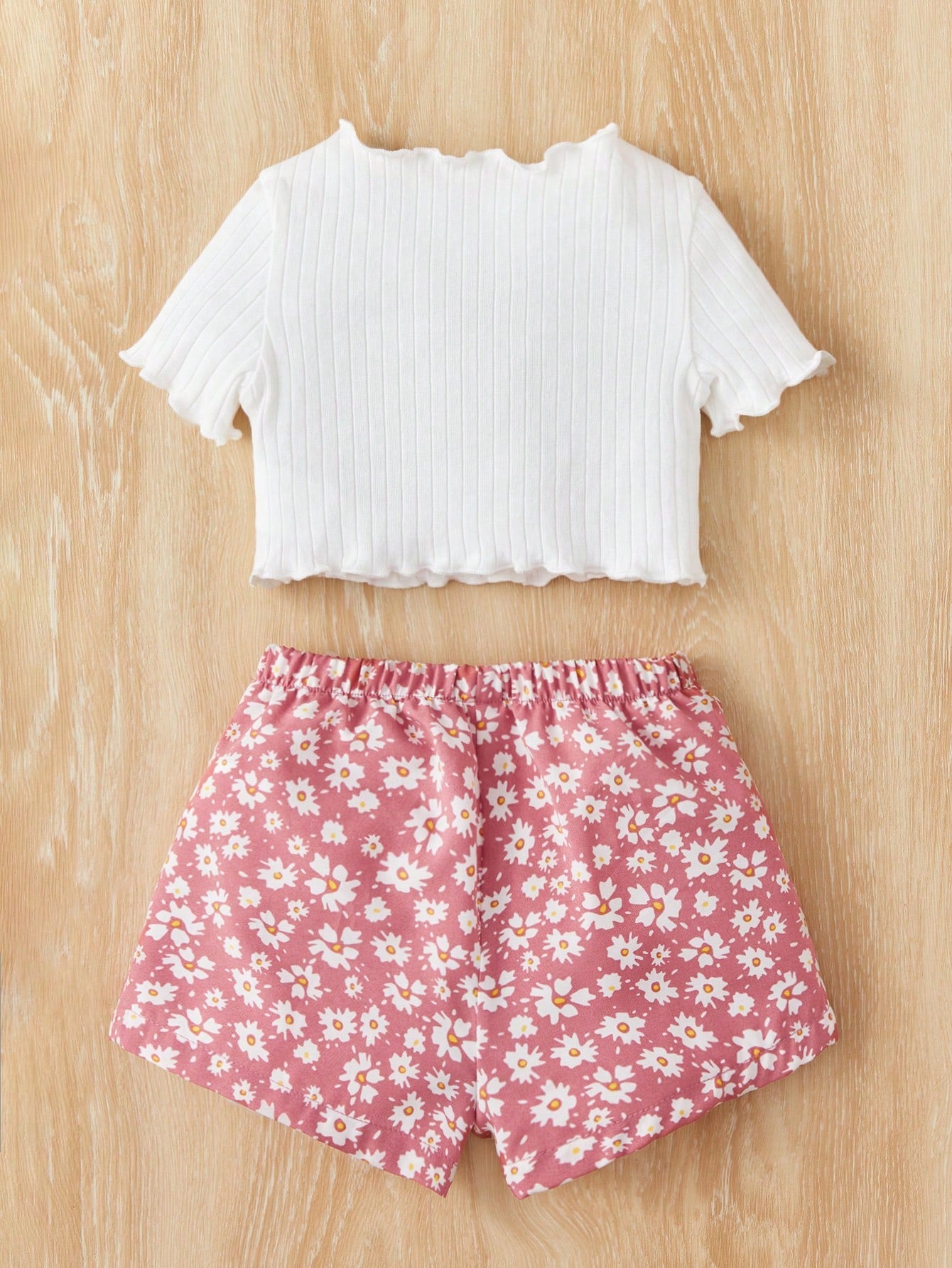 بدلة صبيّة عارضة من قطعتين مكونة من تي شيرت قصّة قصيرة بياقة مزيّنة بالرّوبيّات ذات خصر مطاطيّ وشورت زهري مناسبة لفصل الصيف