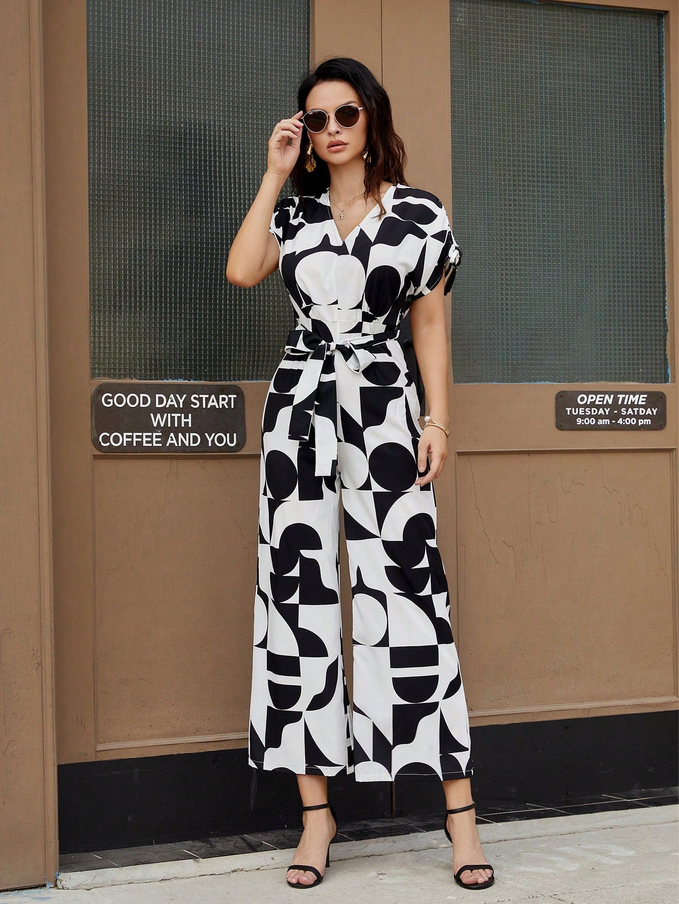 بدلة قصيرة بطبعة عشوائية للنساء مع حزام الخصر