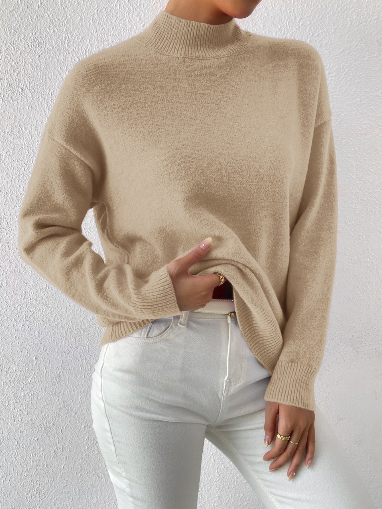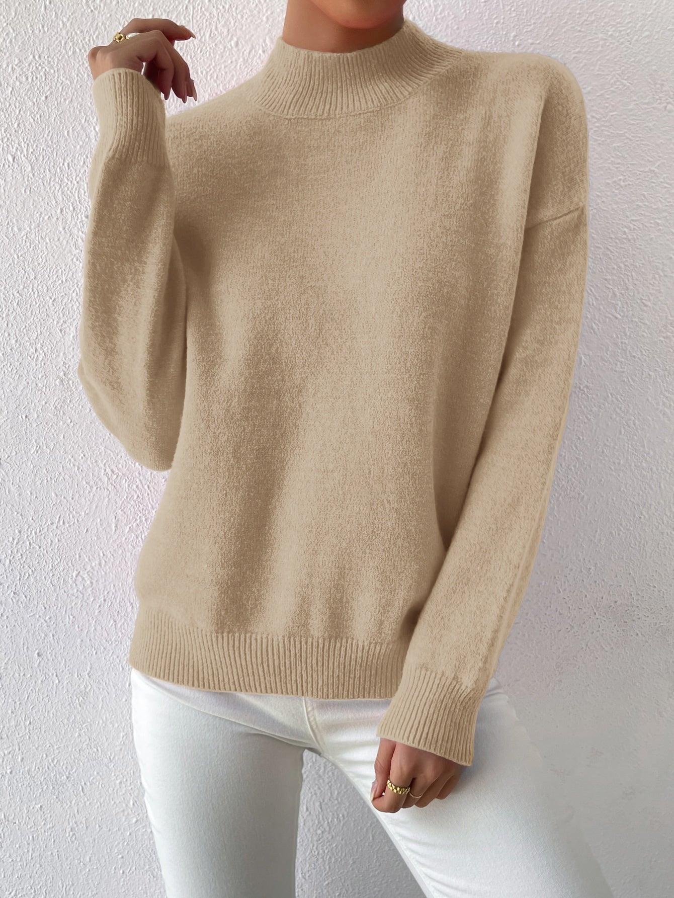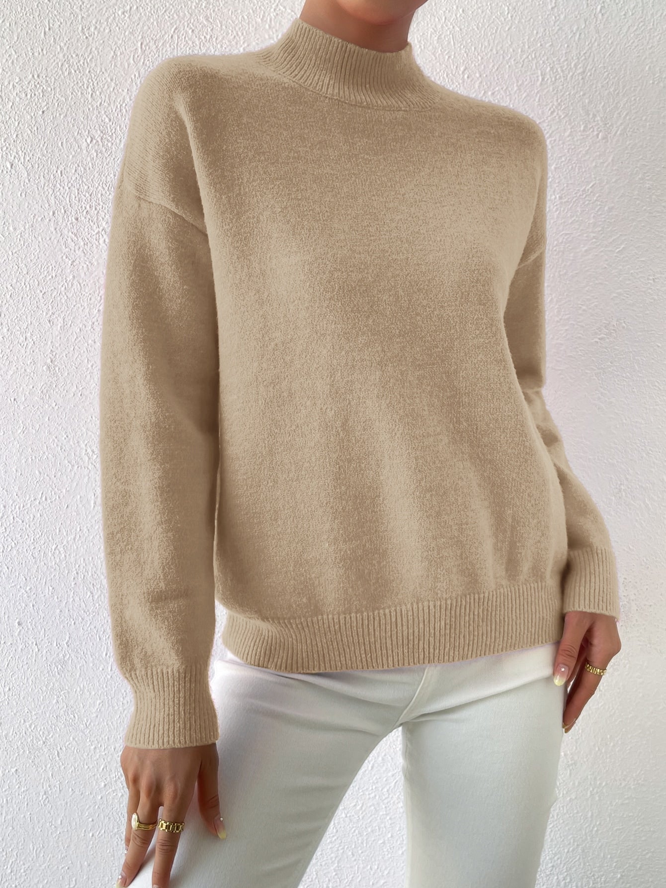 بلوزة كنزة صوفية ذات ياقة مزيفة وأكتاف متساقطة، تناسب السيدات للخريف والربيع، كم طويل بياقة عادية وأكتاف متساقطة بلون المشمش
