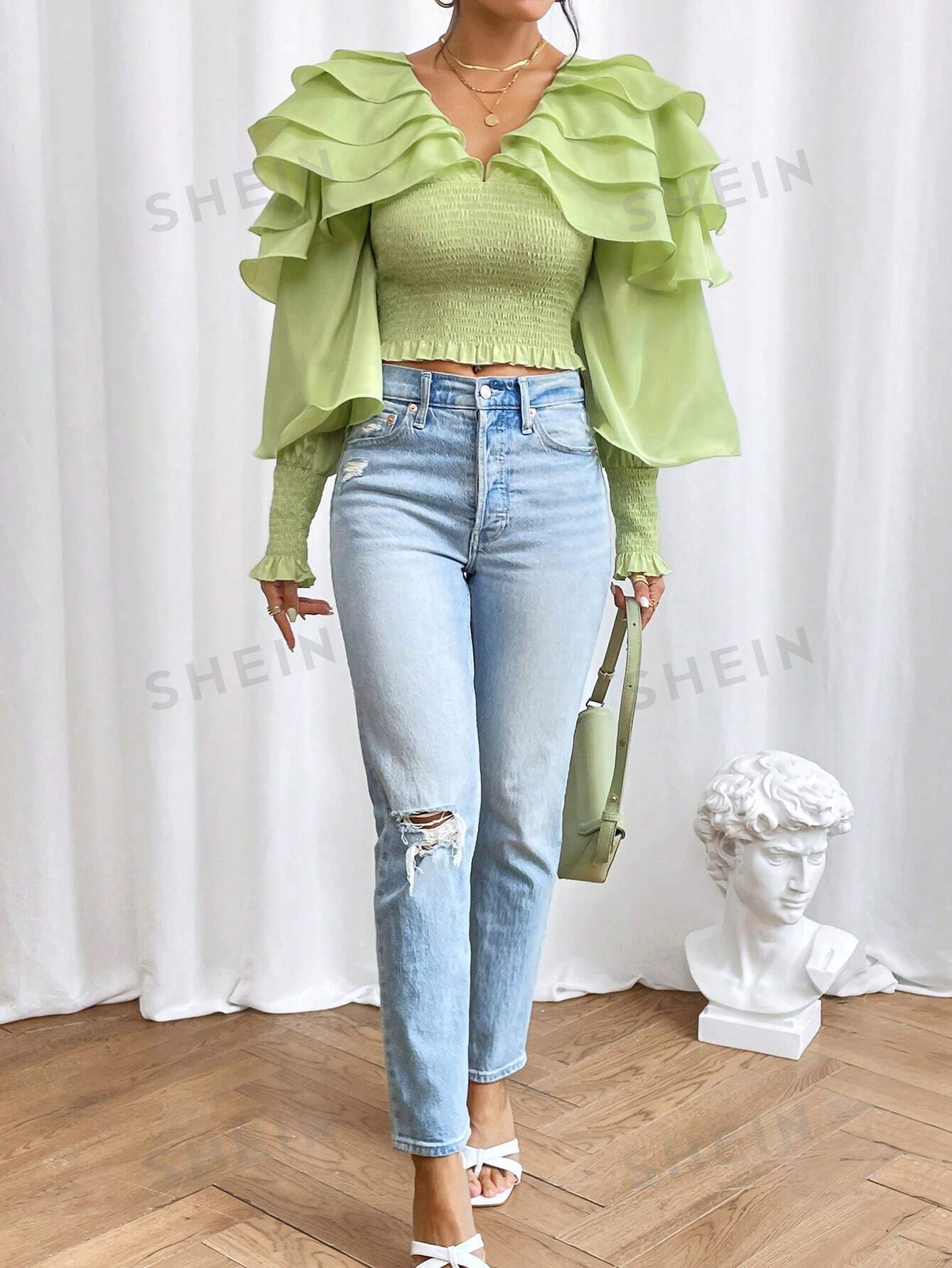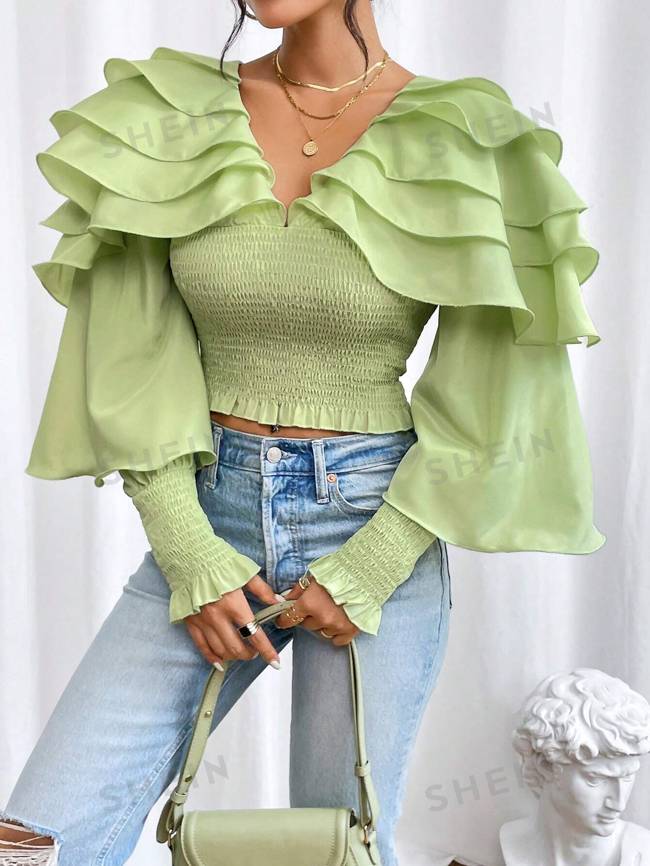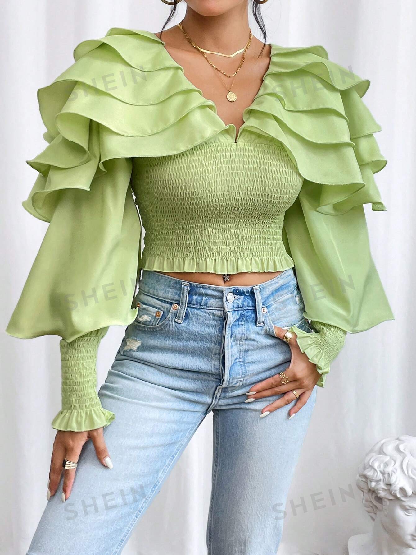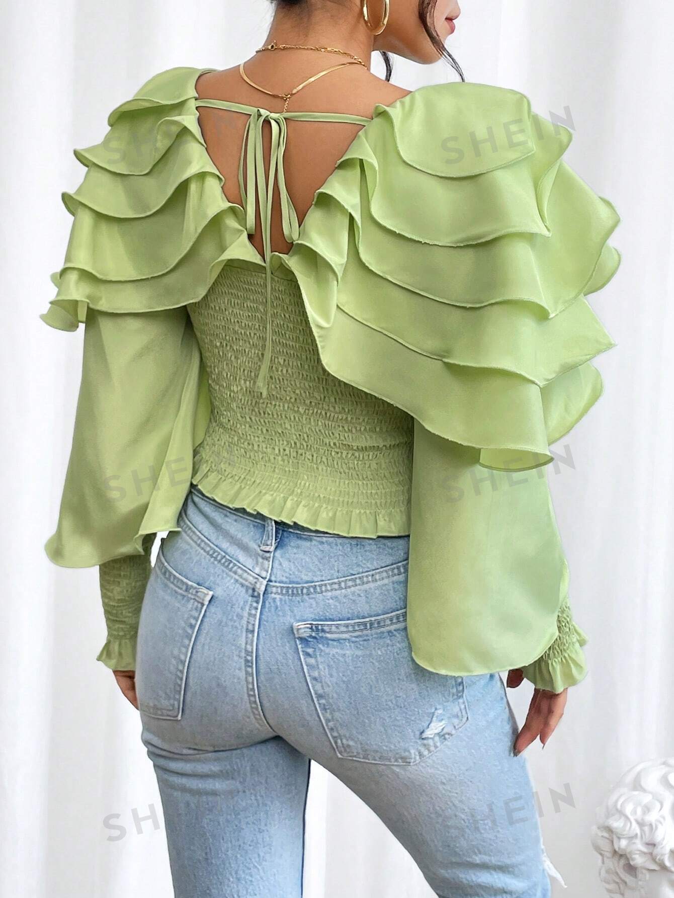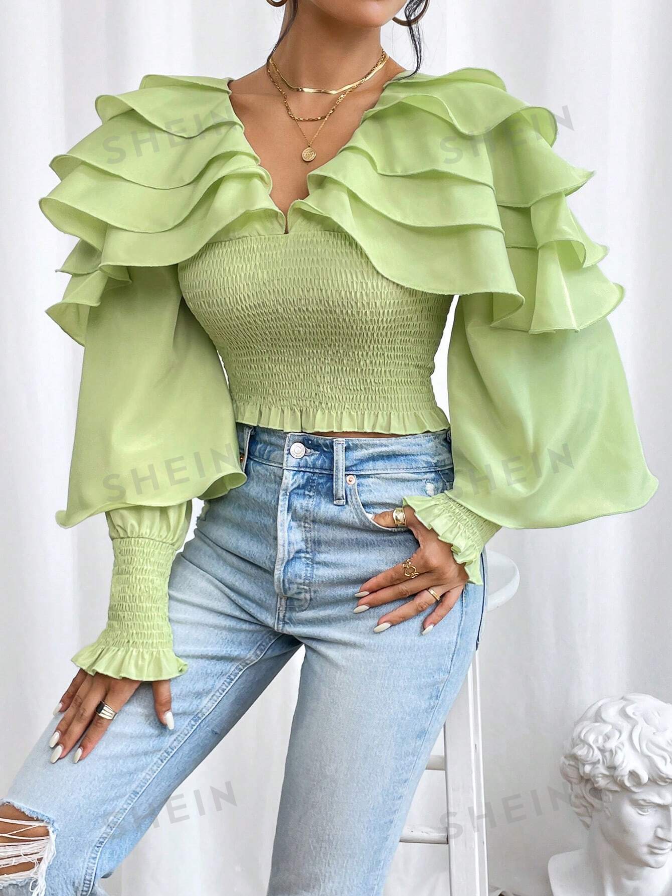 بلوزة موحدة اللون طبقات كشكش كبير مقلم بغرز