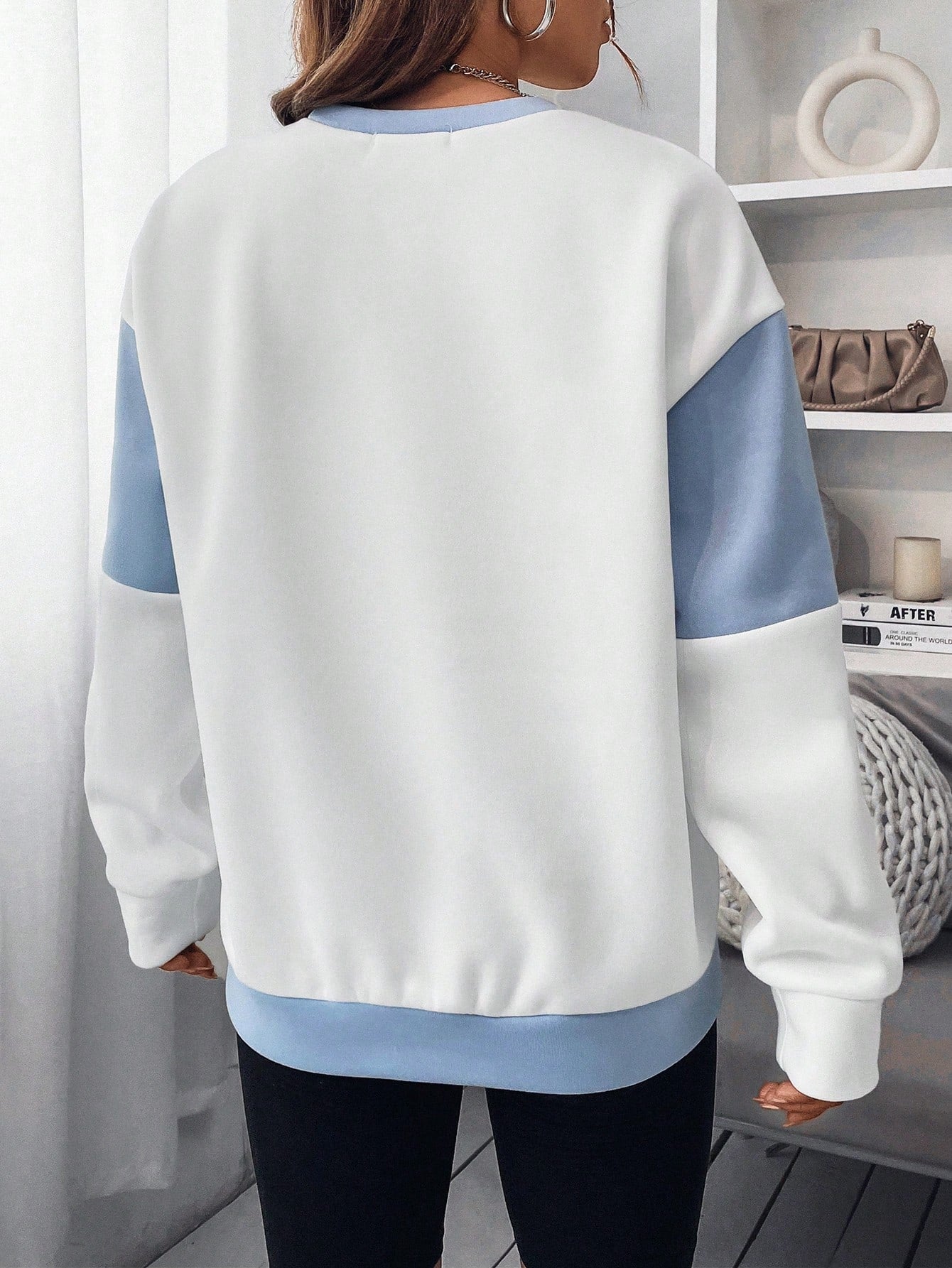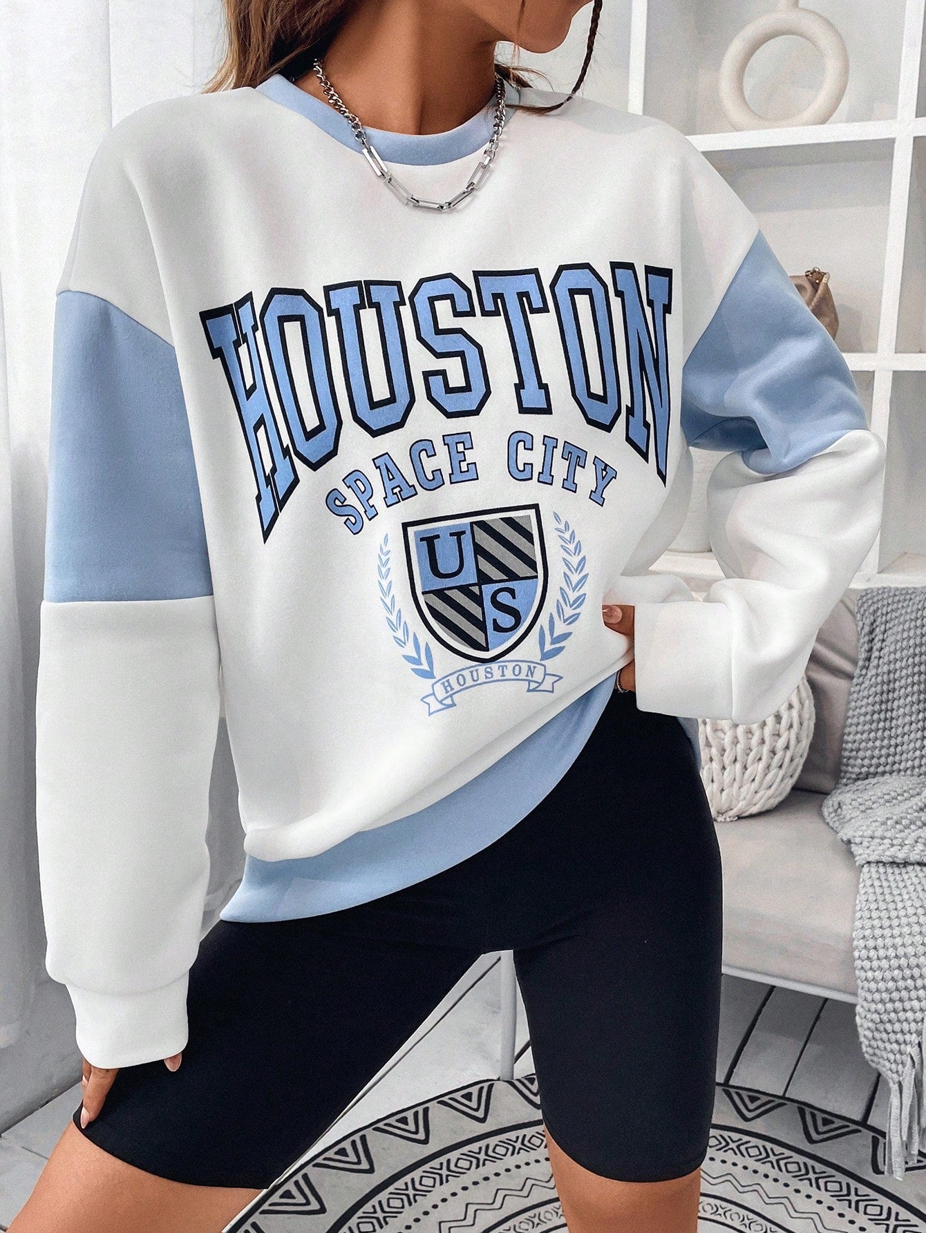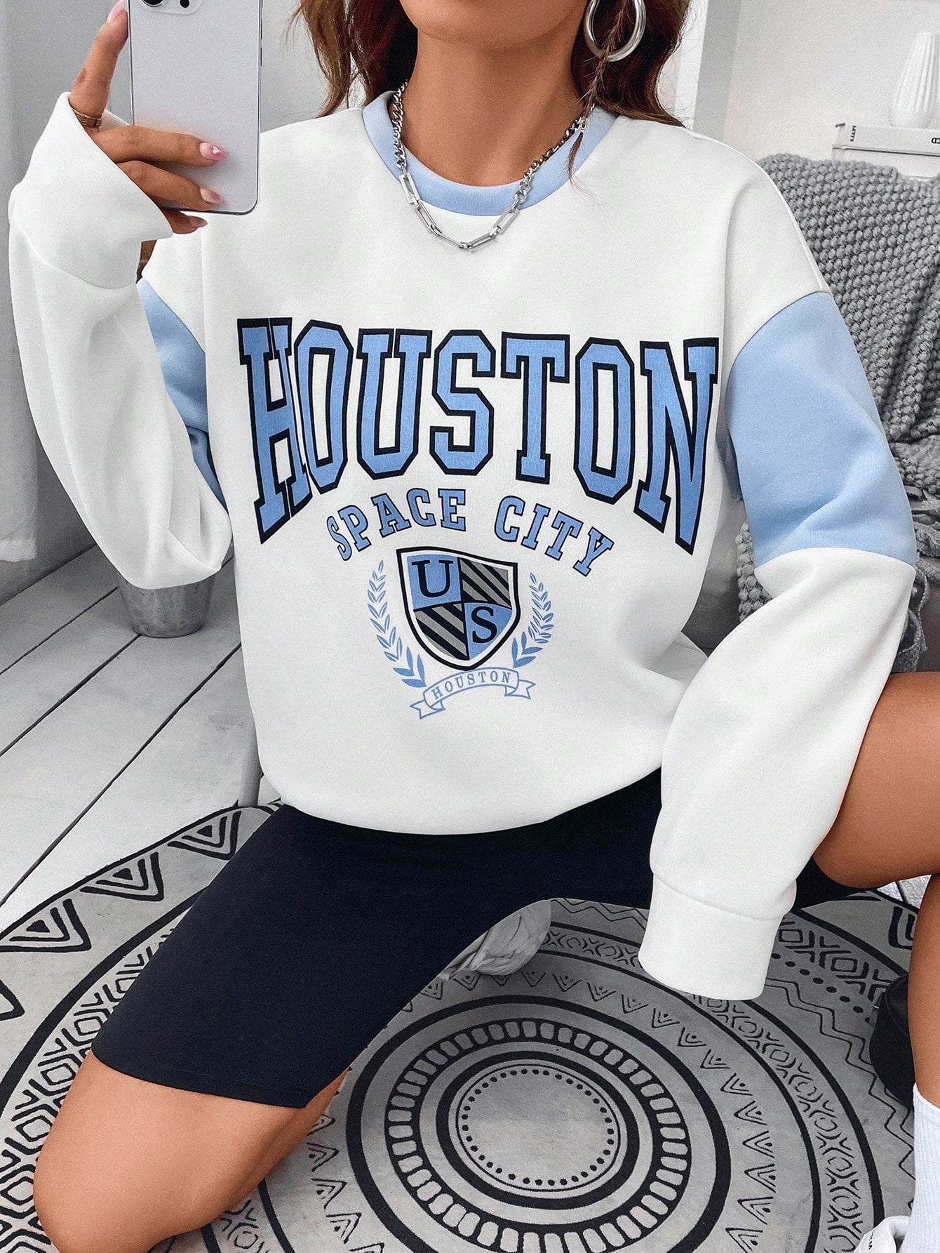 بلوفر رياضي ذو أكتاف متساقطة عليه رسمة حرفية
