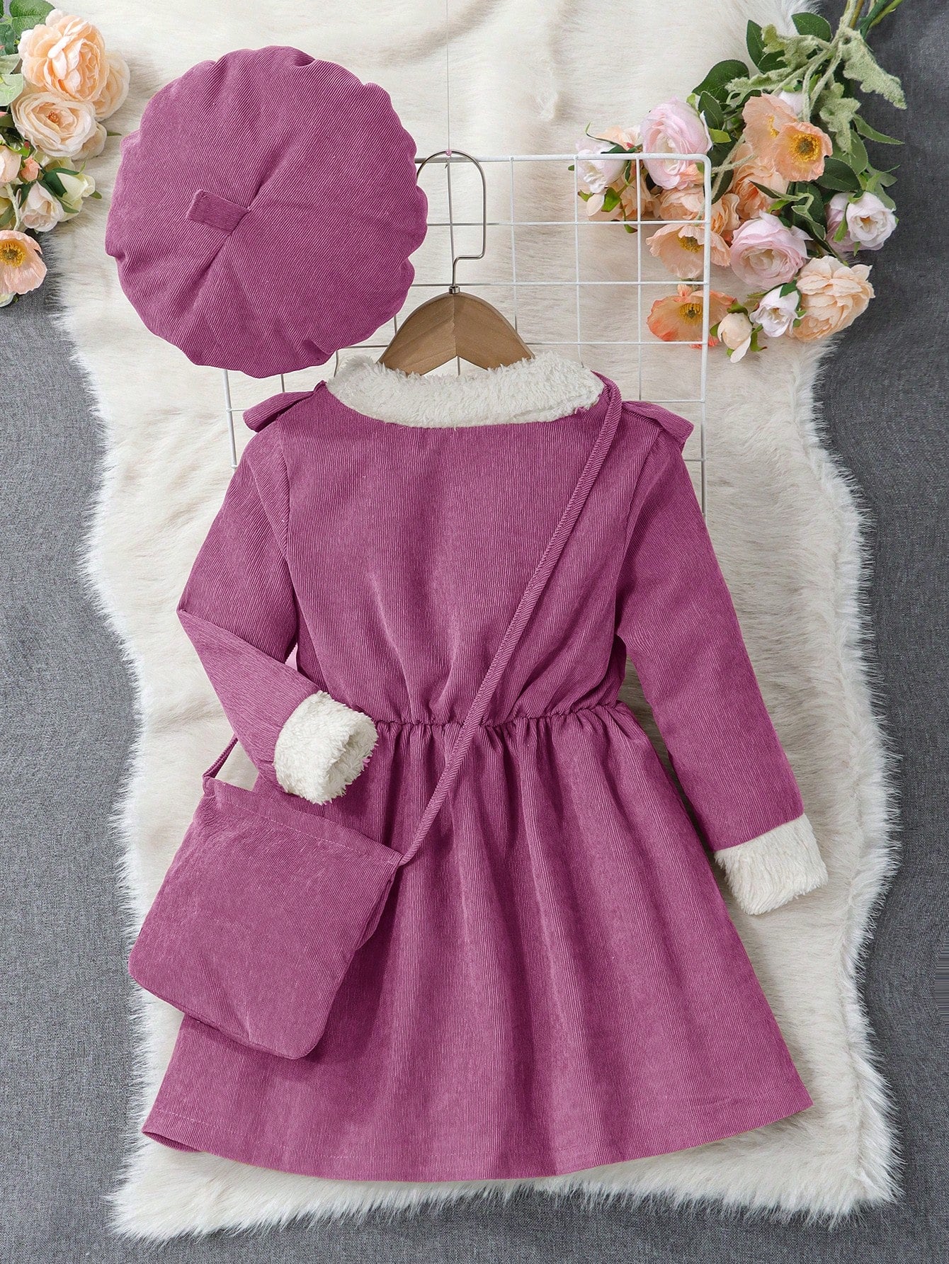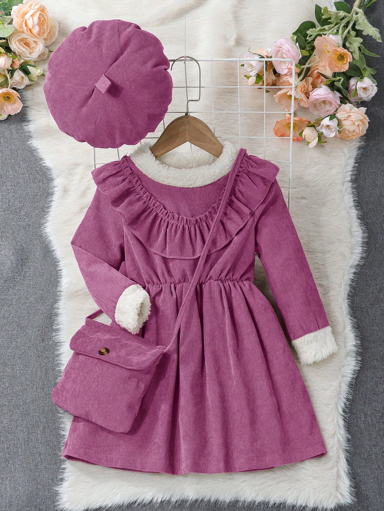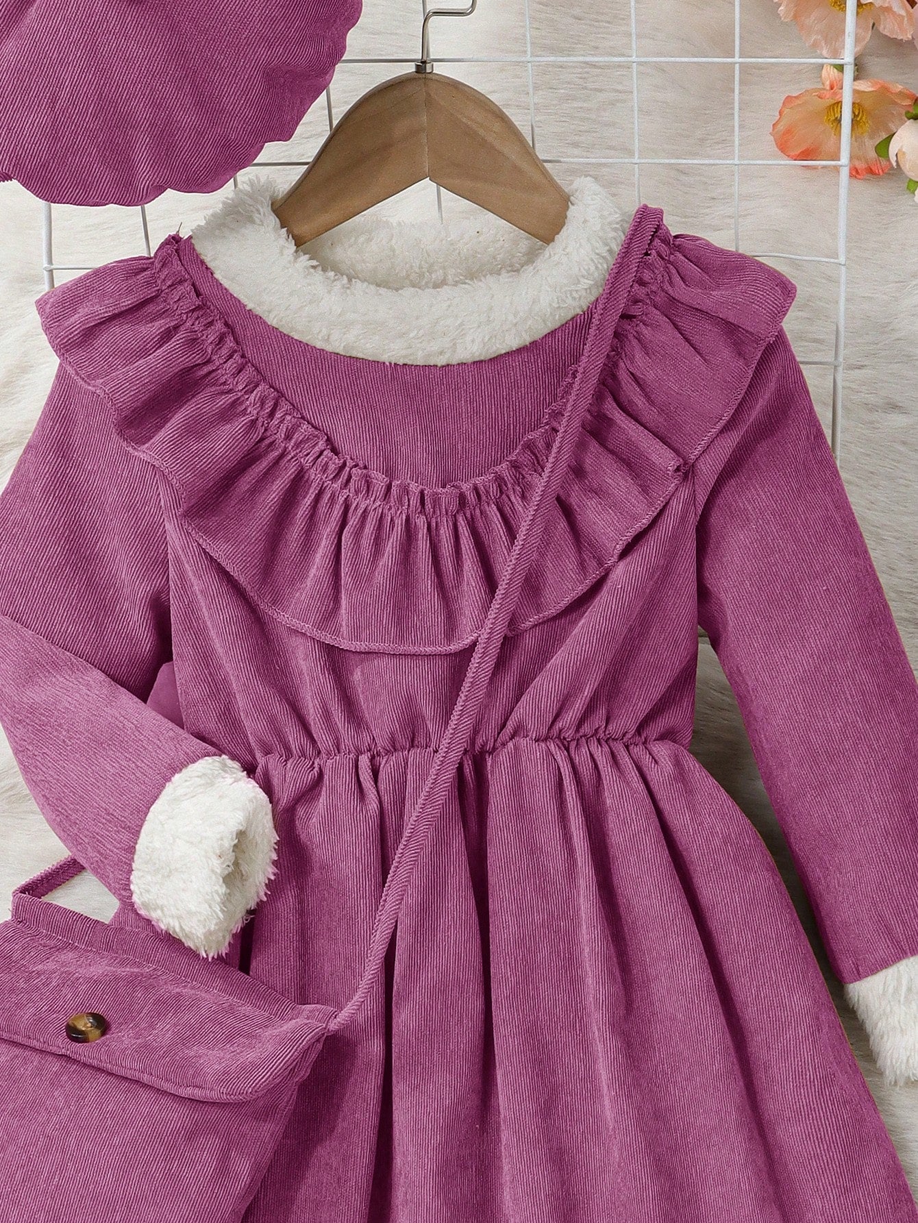 بنات مقلم بكشكش فستان مع اكسسوارت قبعة & حقيبة