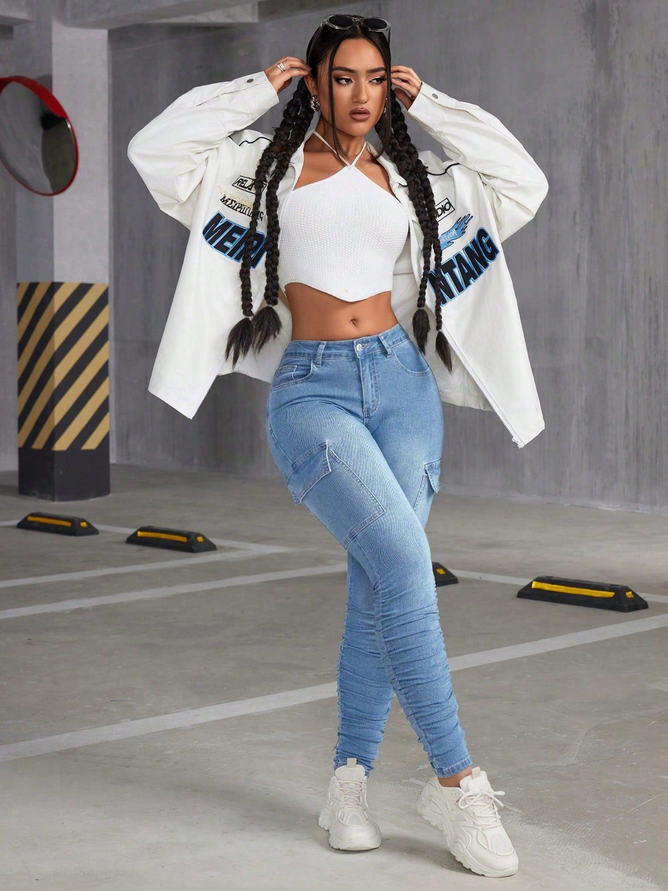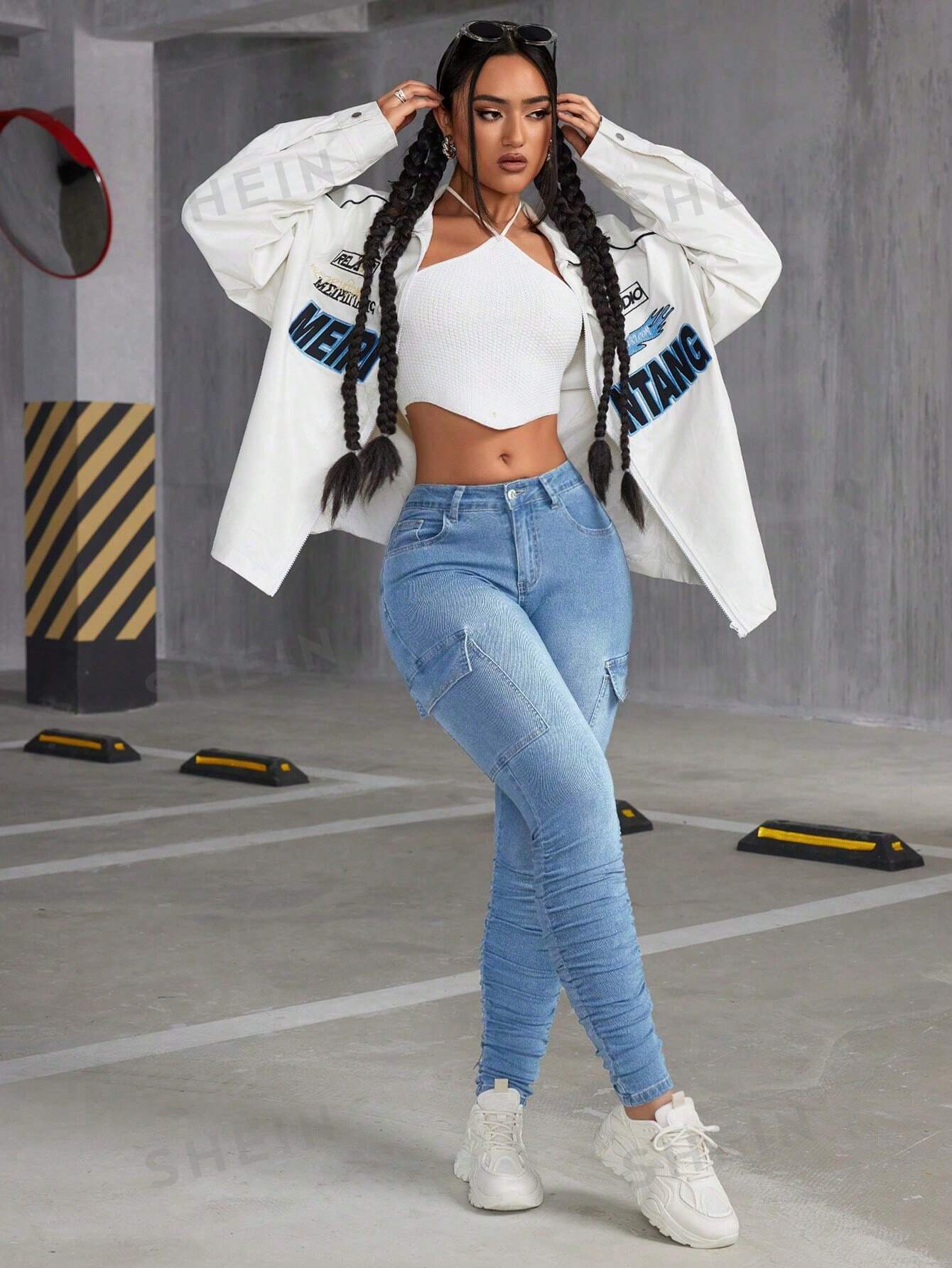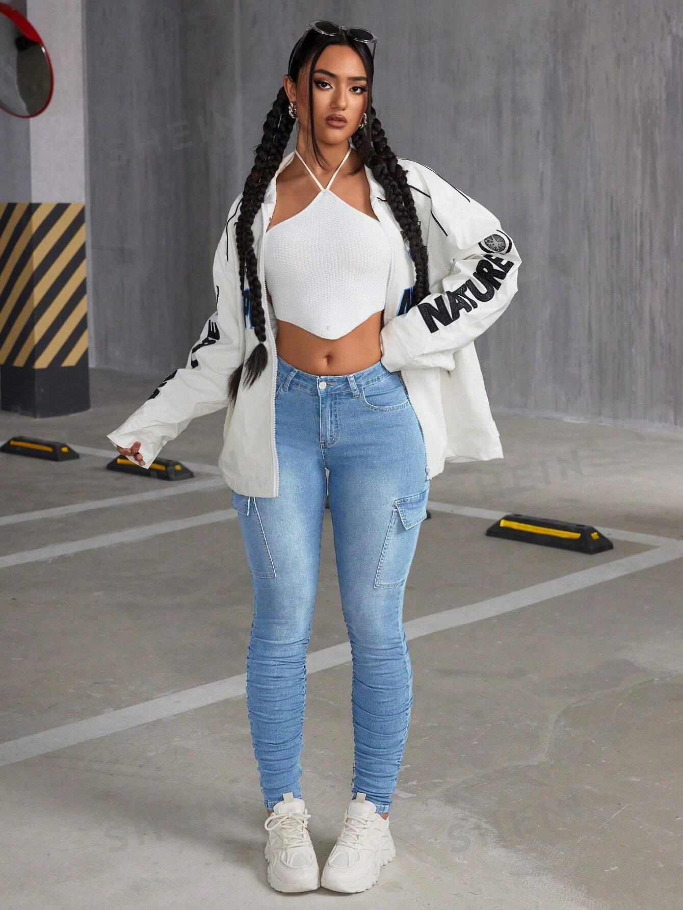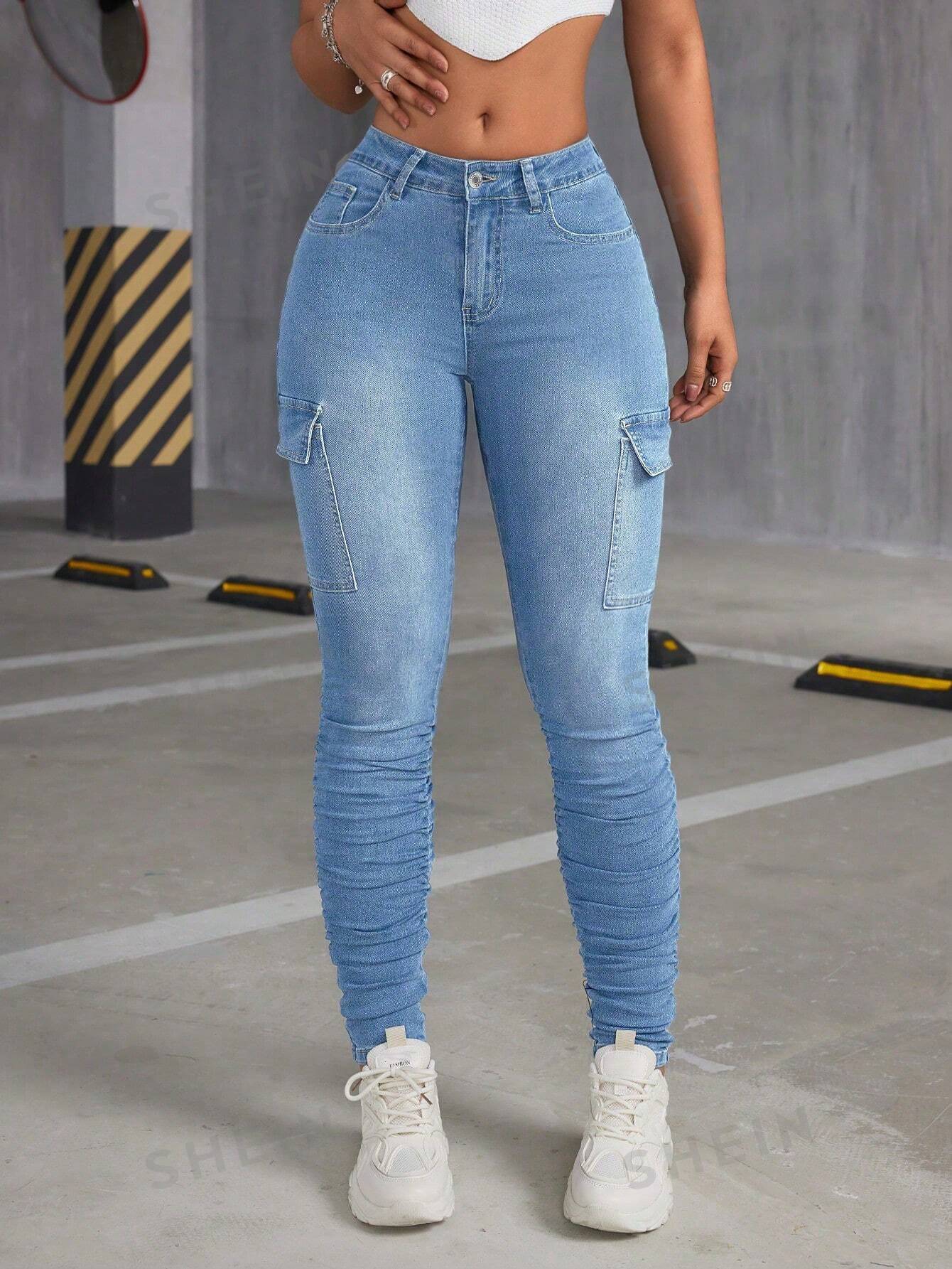 بنطال جينز كارجو بقصة ضيقة وثنيات مرنة
