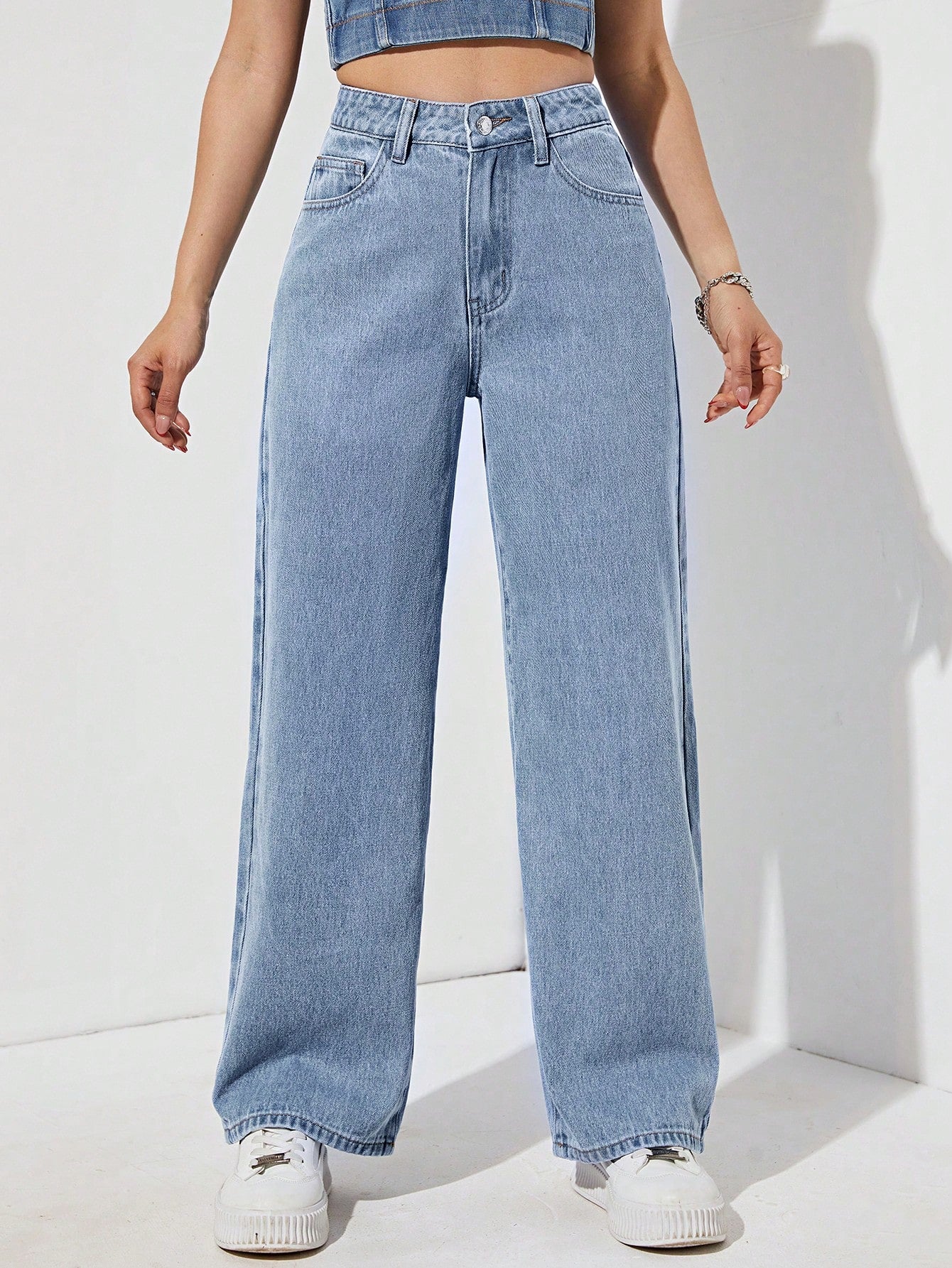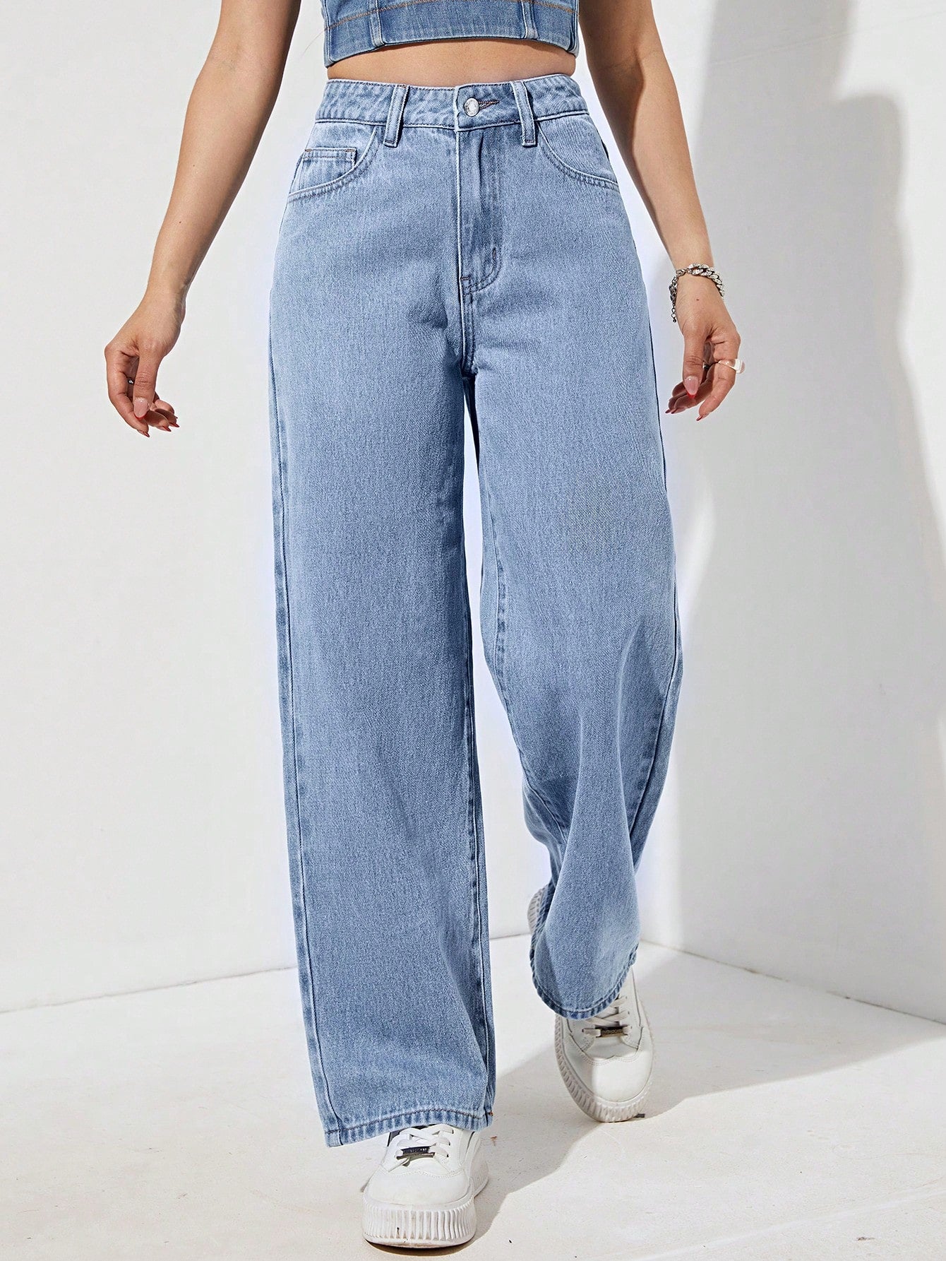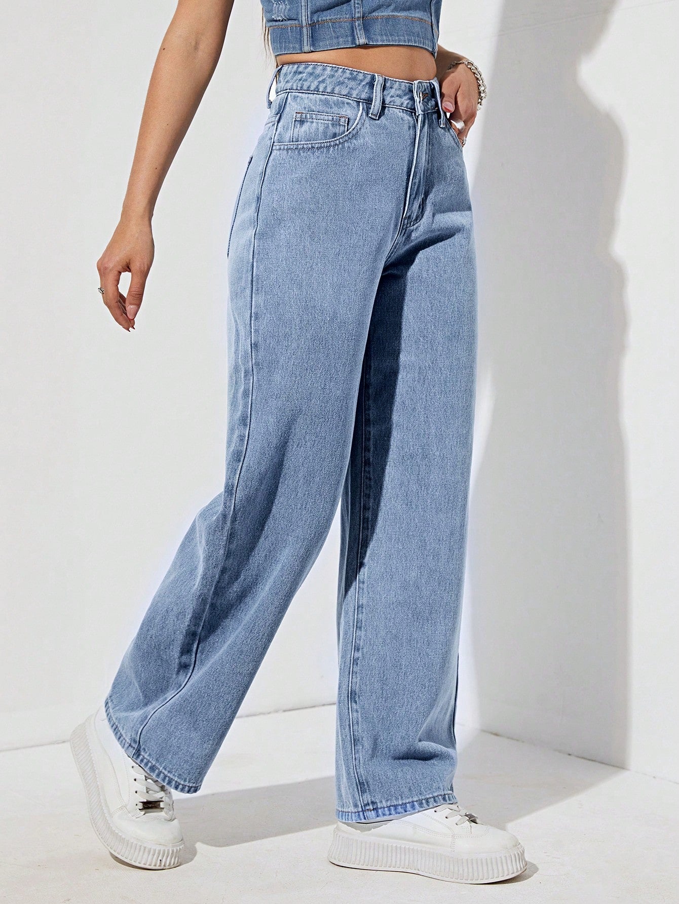 بنطلون جينز موحدة اللون خصر عالي ساق عريضة