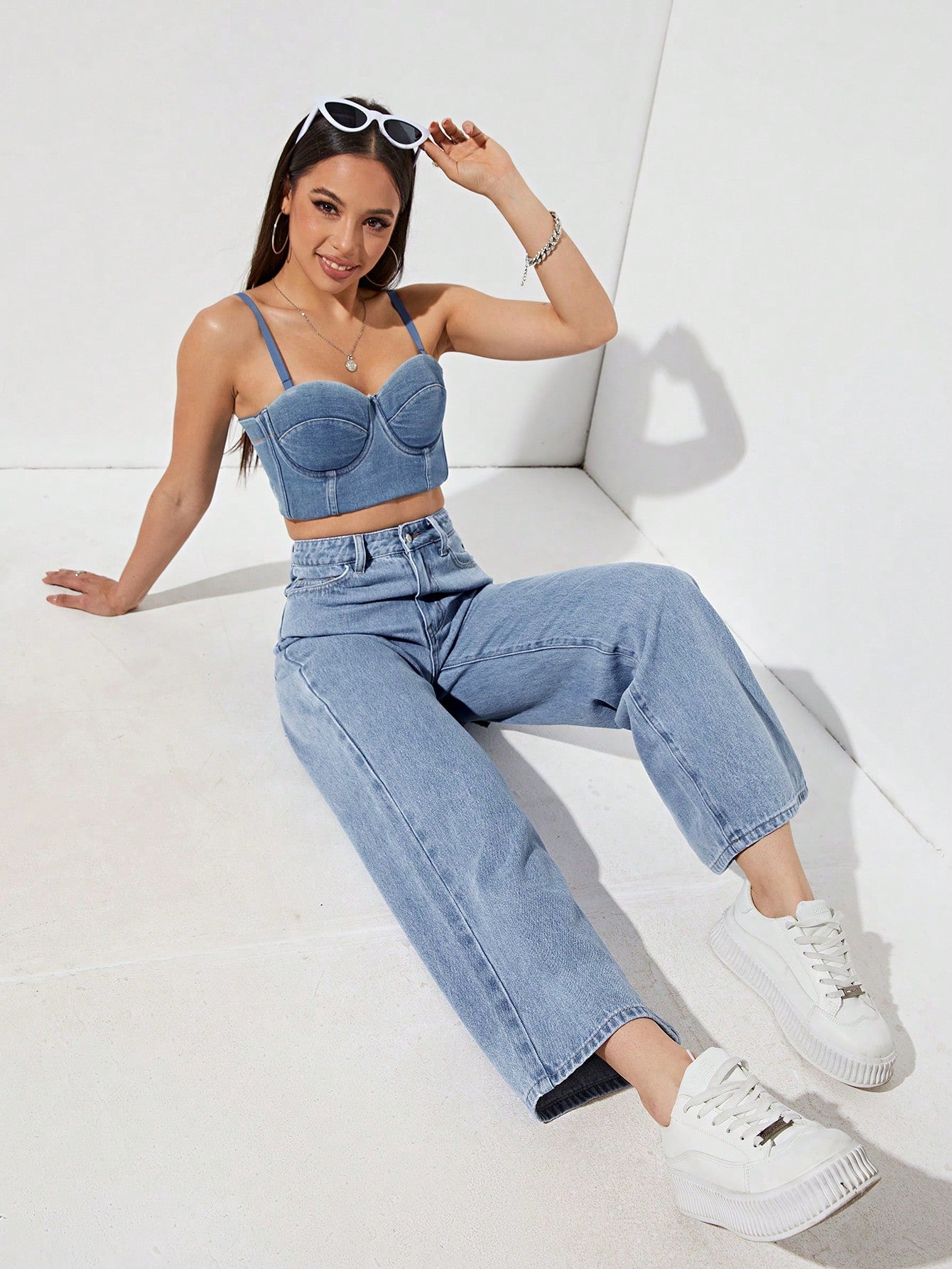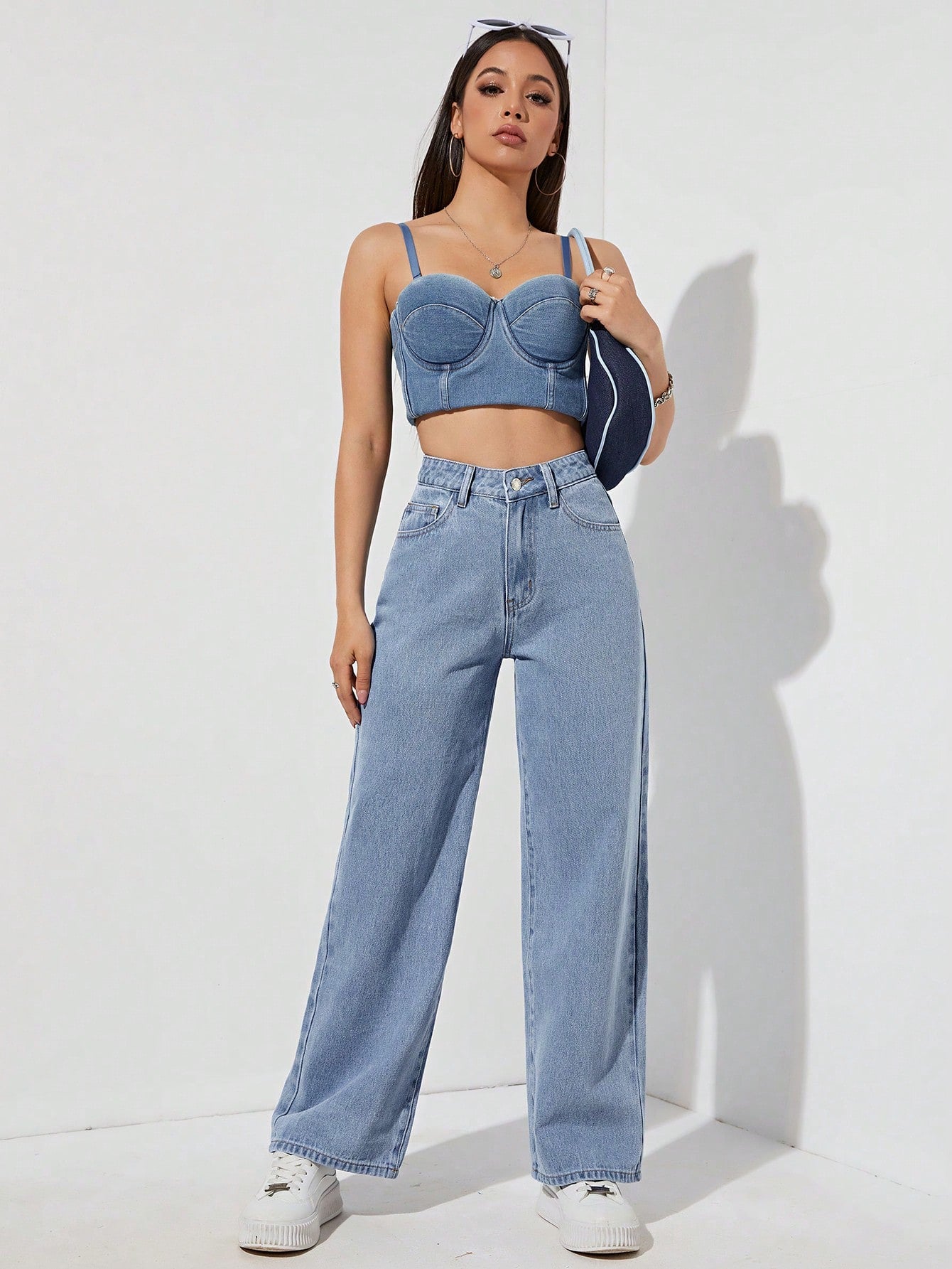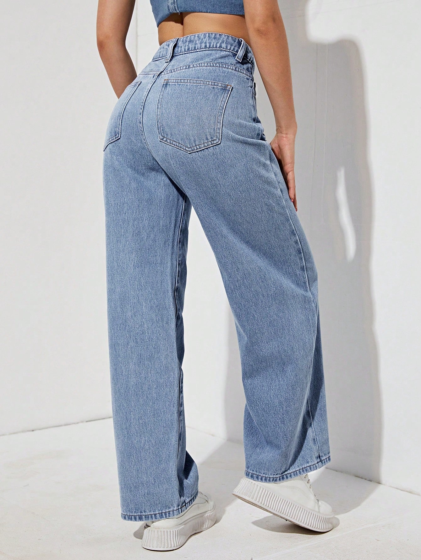 بنطلون جينز موحدة اللون خصر عالي ساق عريضة