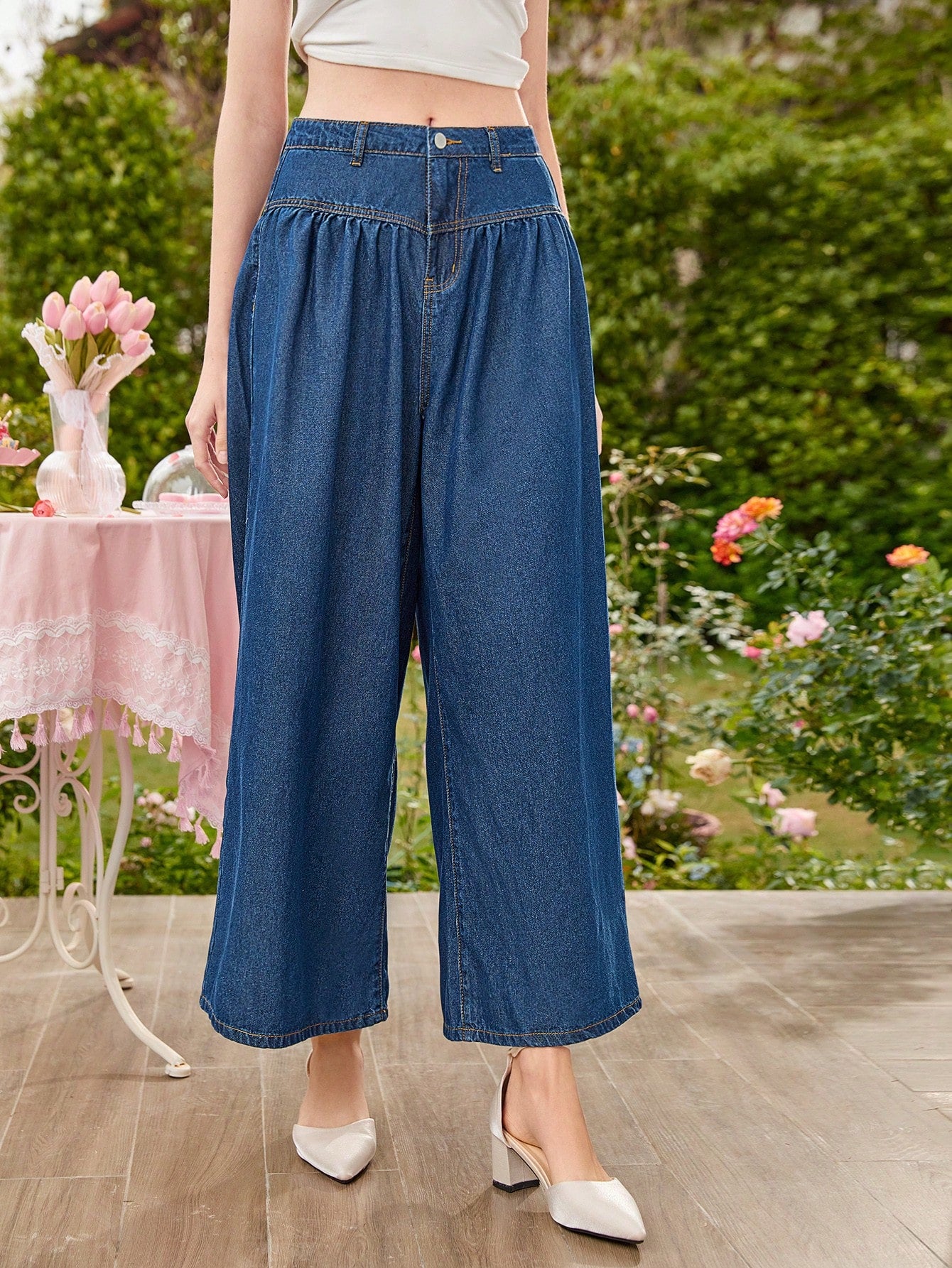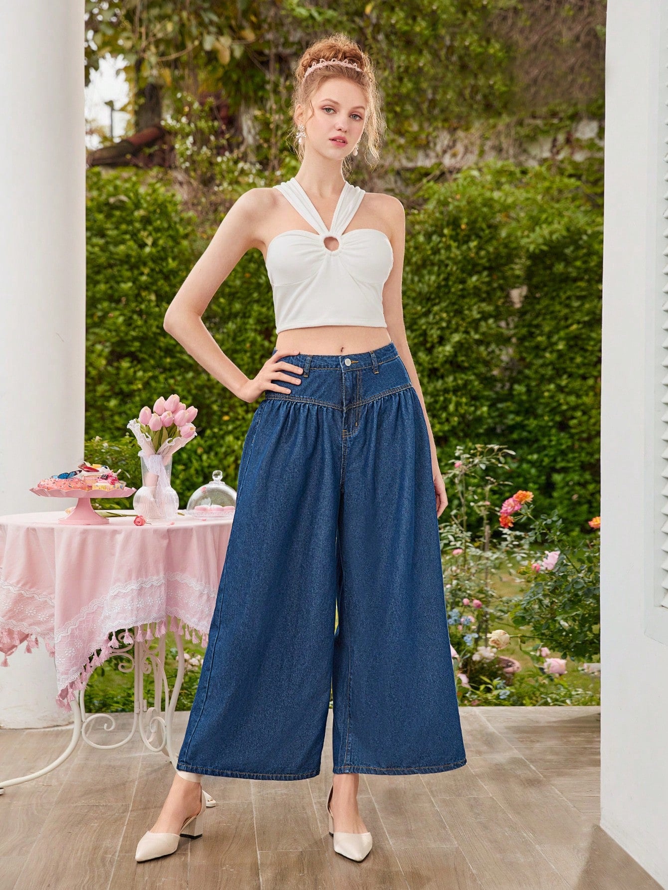 بنطلون جينز موحدة اللون مطوي ساق عريضة