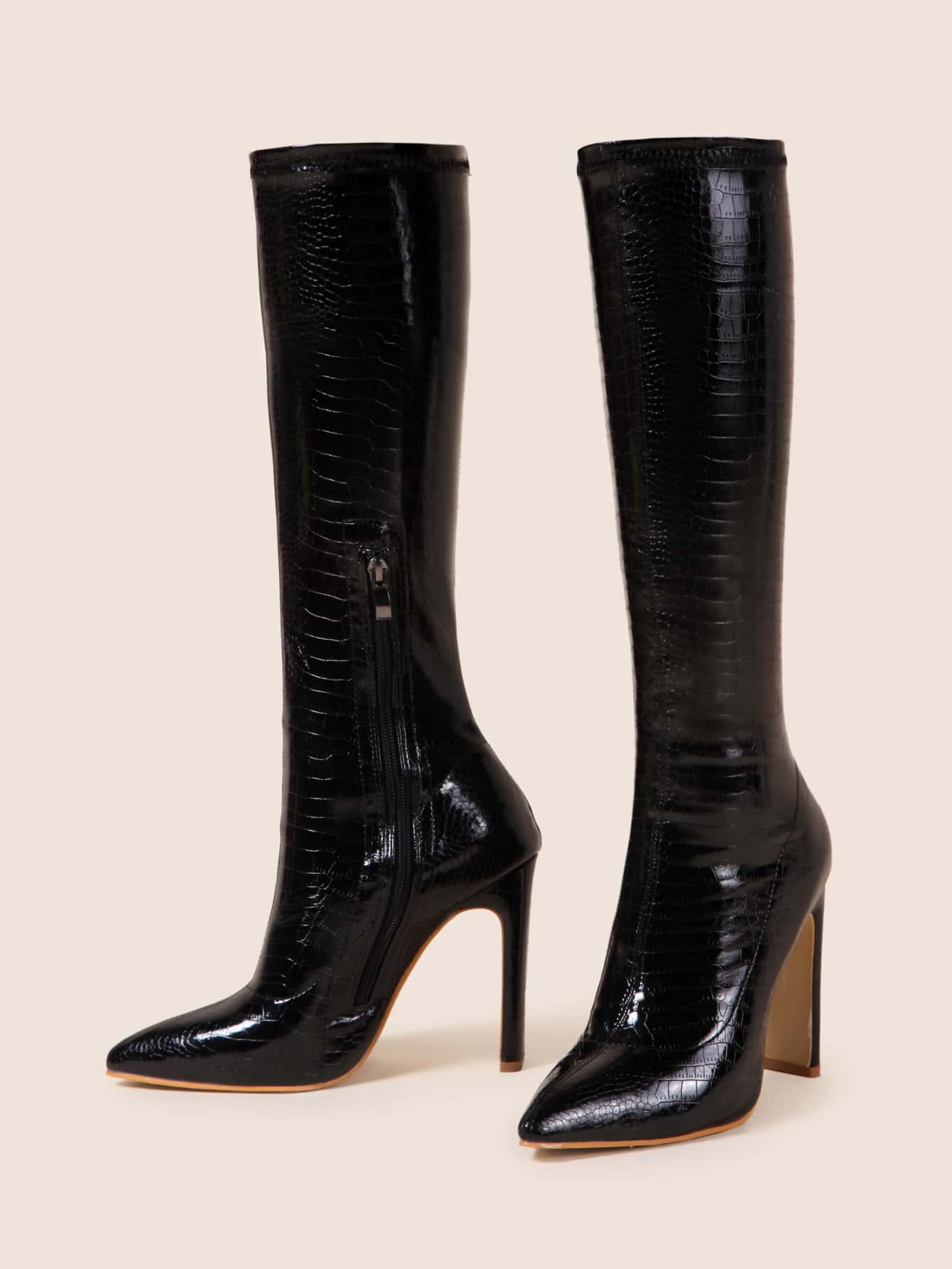 بوت نسائية فوق الركبة مشيرة إلى الأصبع بكعب عالي باللون الأسود