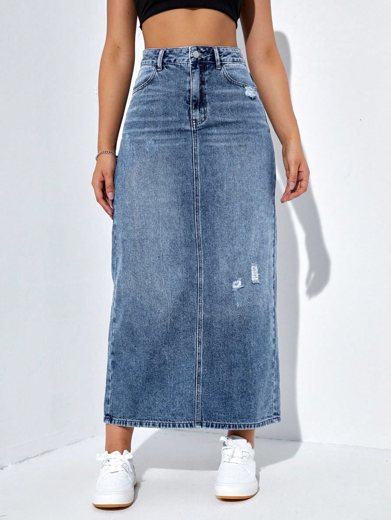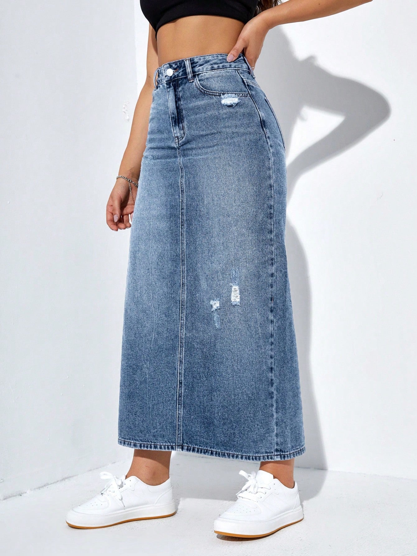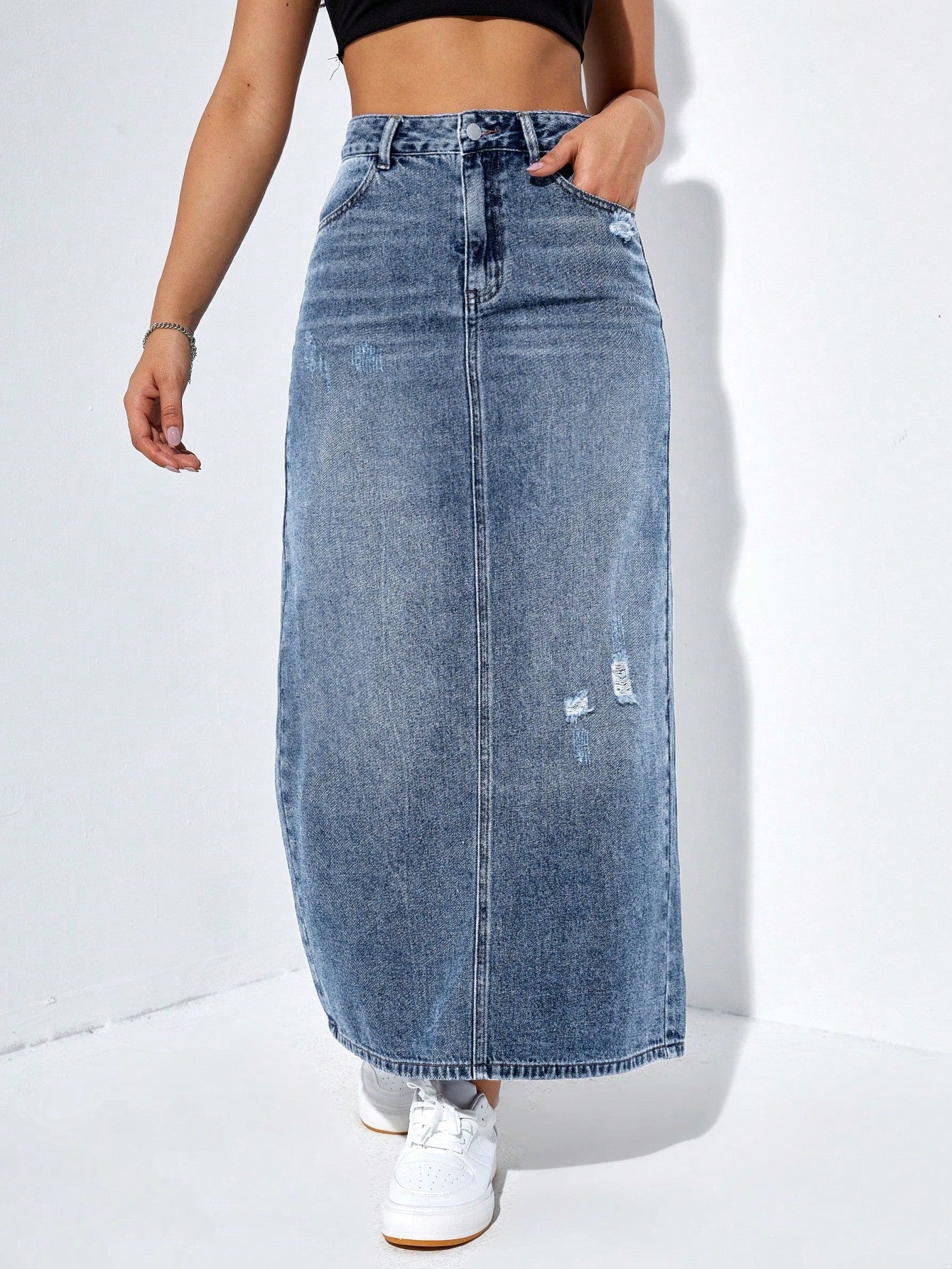 تنورة جينز طويلة بتفاصيل متهالكة وشق في الحاشية