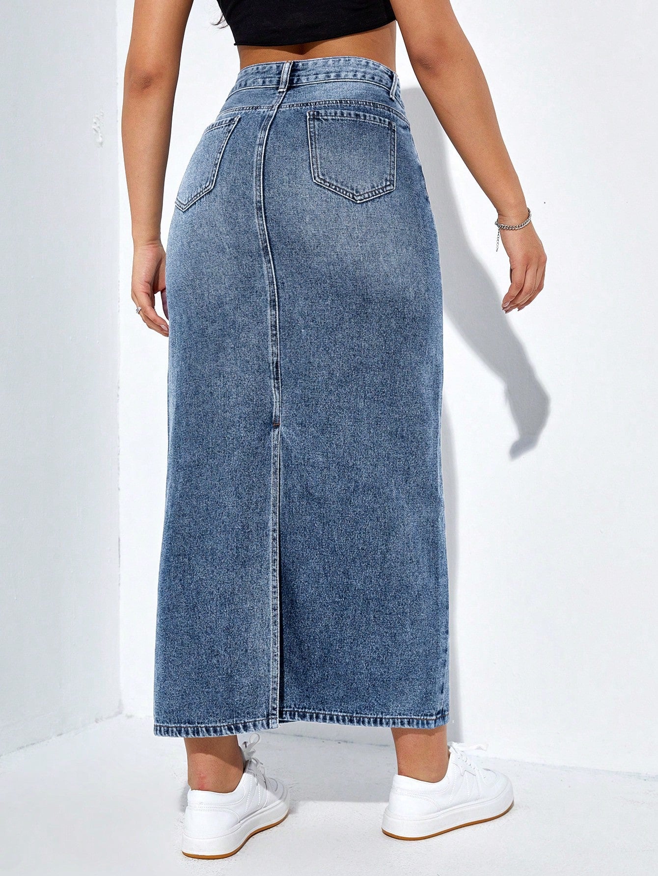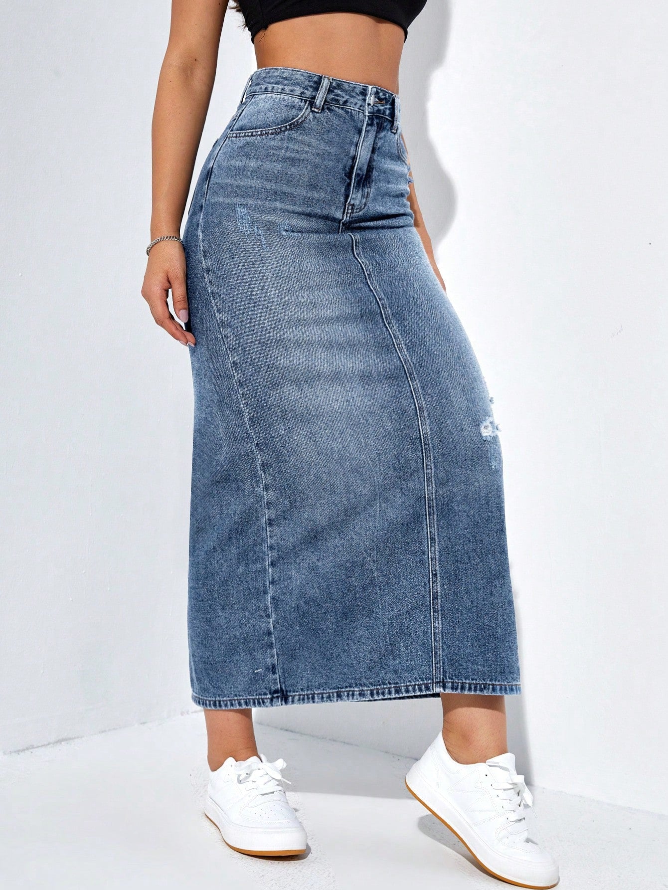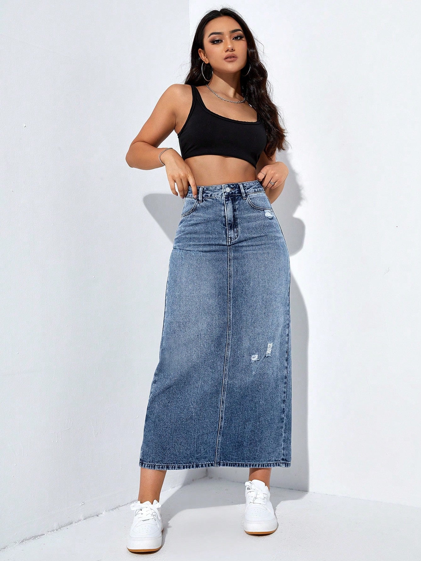 تنورة جينز طويلة بتفاصيل متهالكة وشق في الحاشية