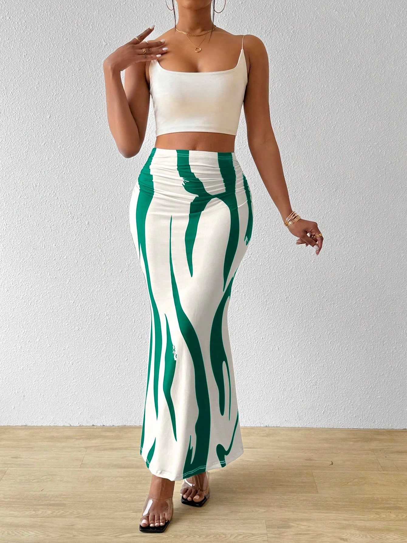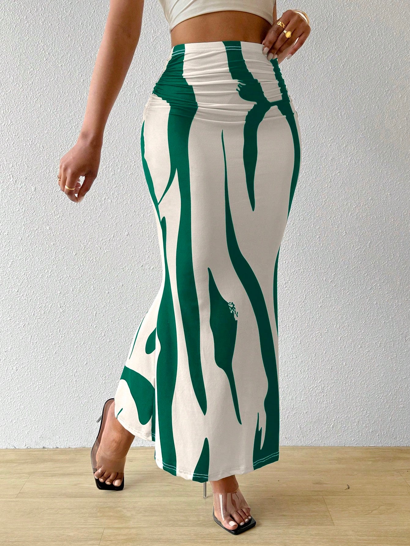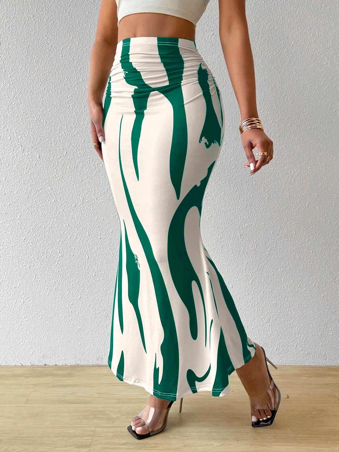 تنورة ذيل سمكة مطبوعة طويلة للنساء مع تجاعيد أنيقة وعصرية على الخصر