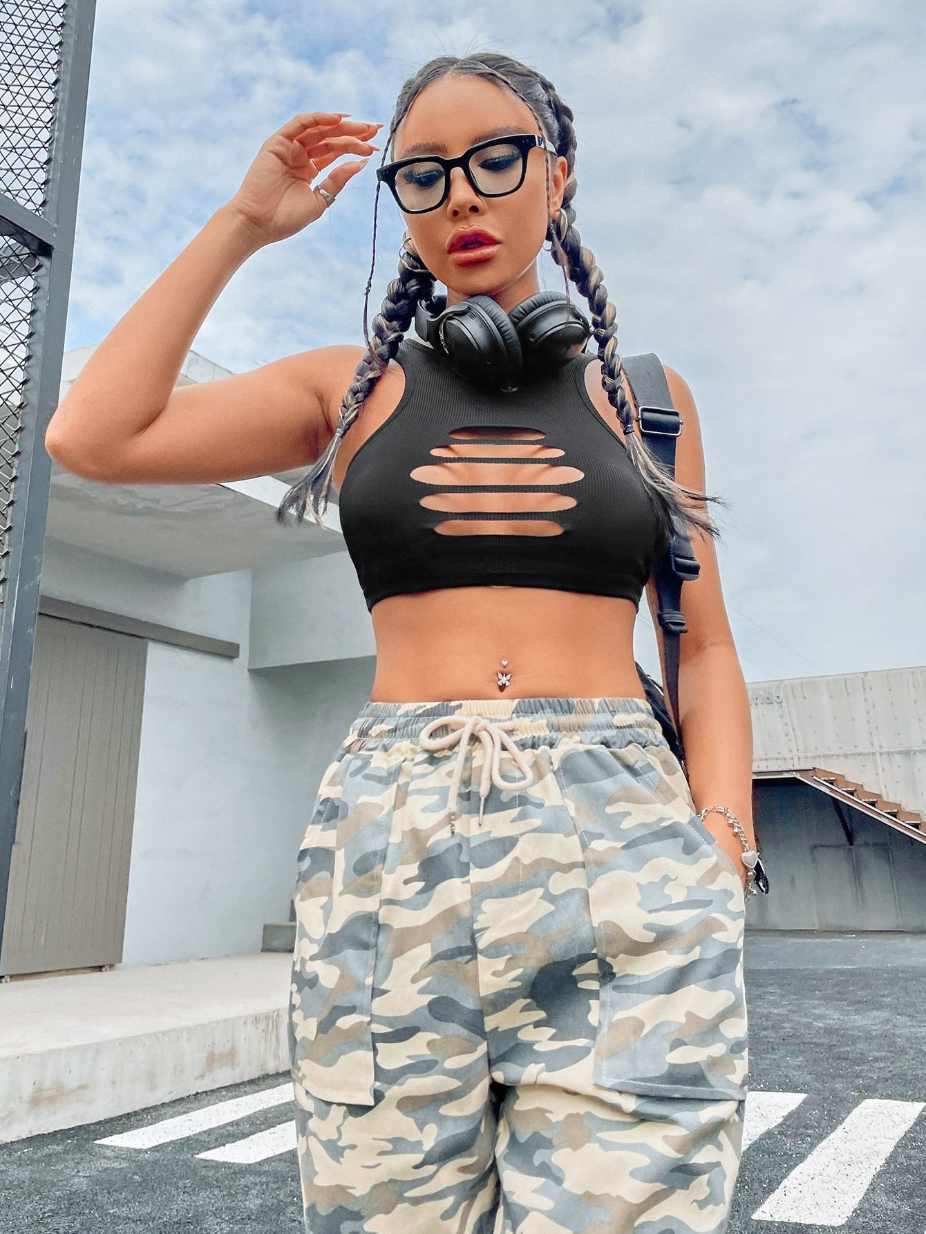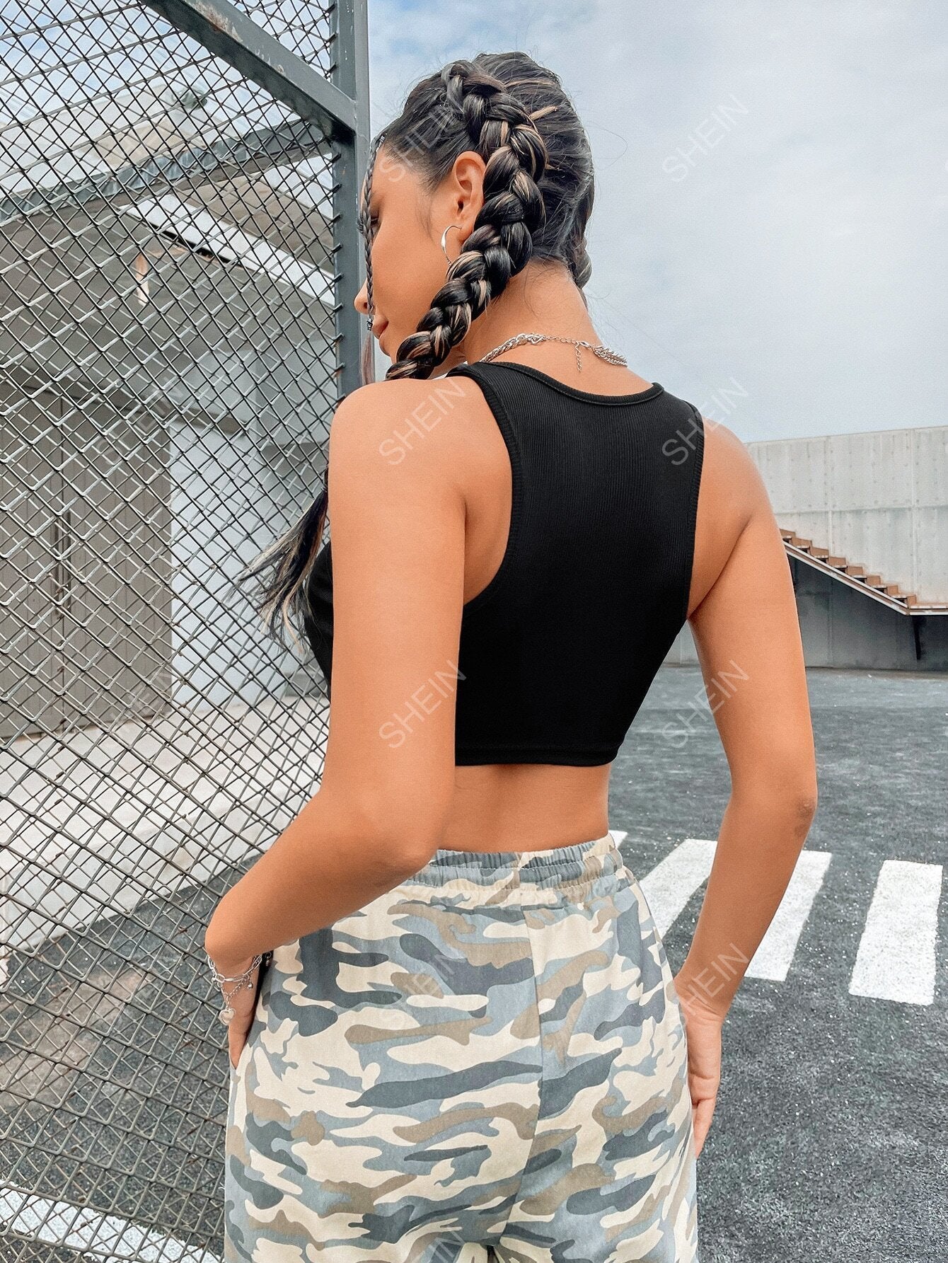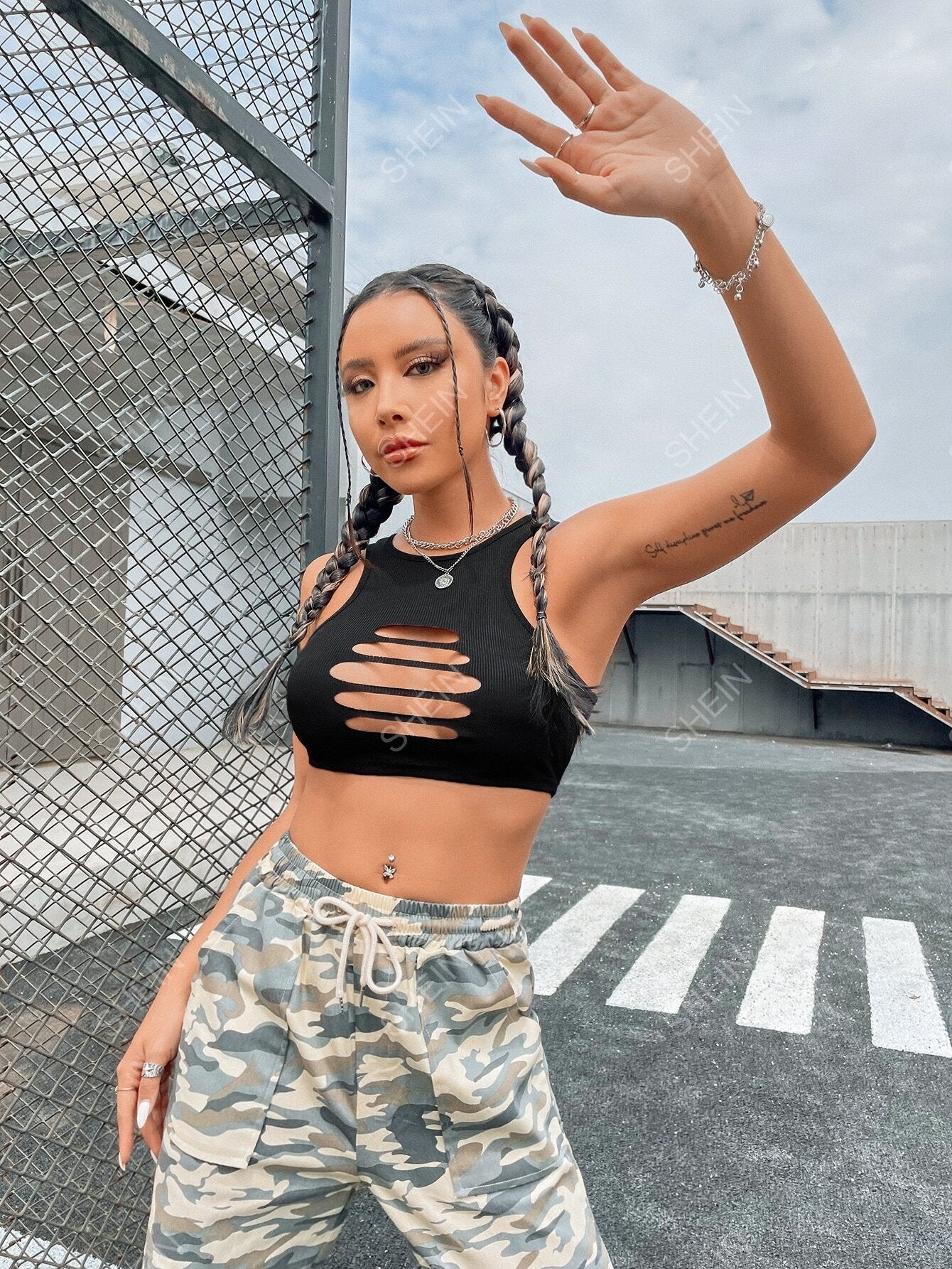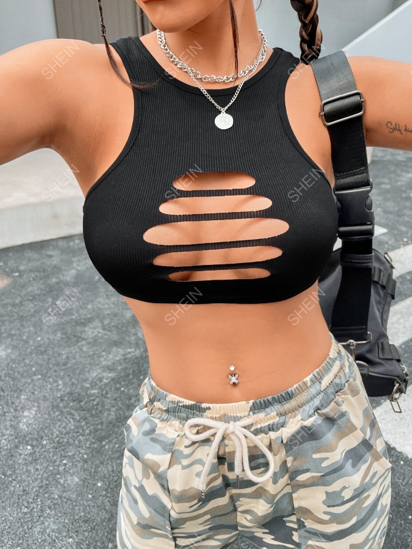 توب بدون أكمام و مقصوص من الأمام بتصميم الريب المحبوك باللون الأسود بطراز