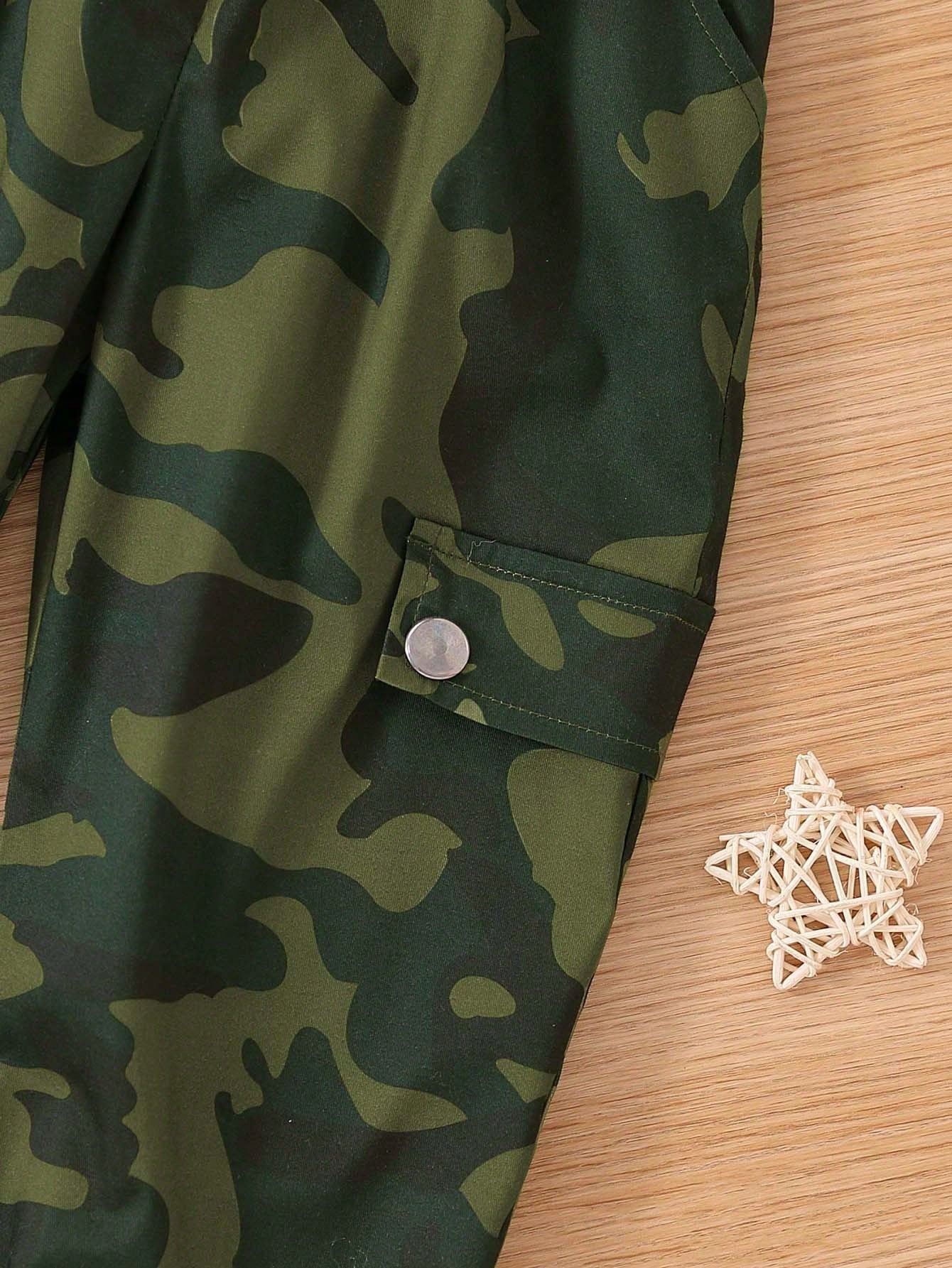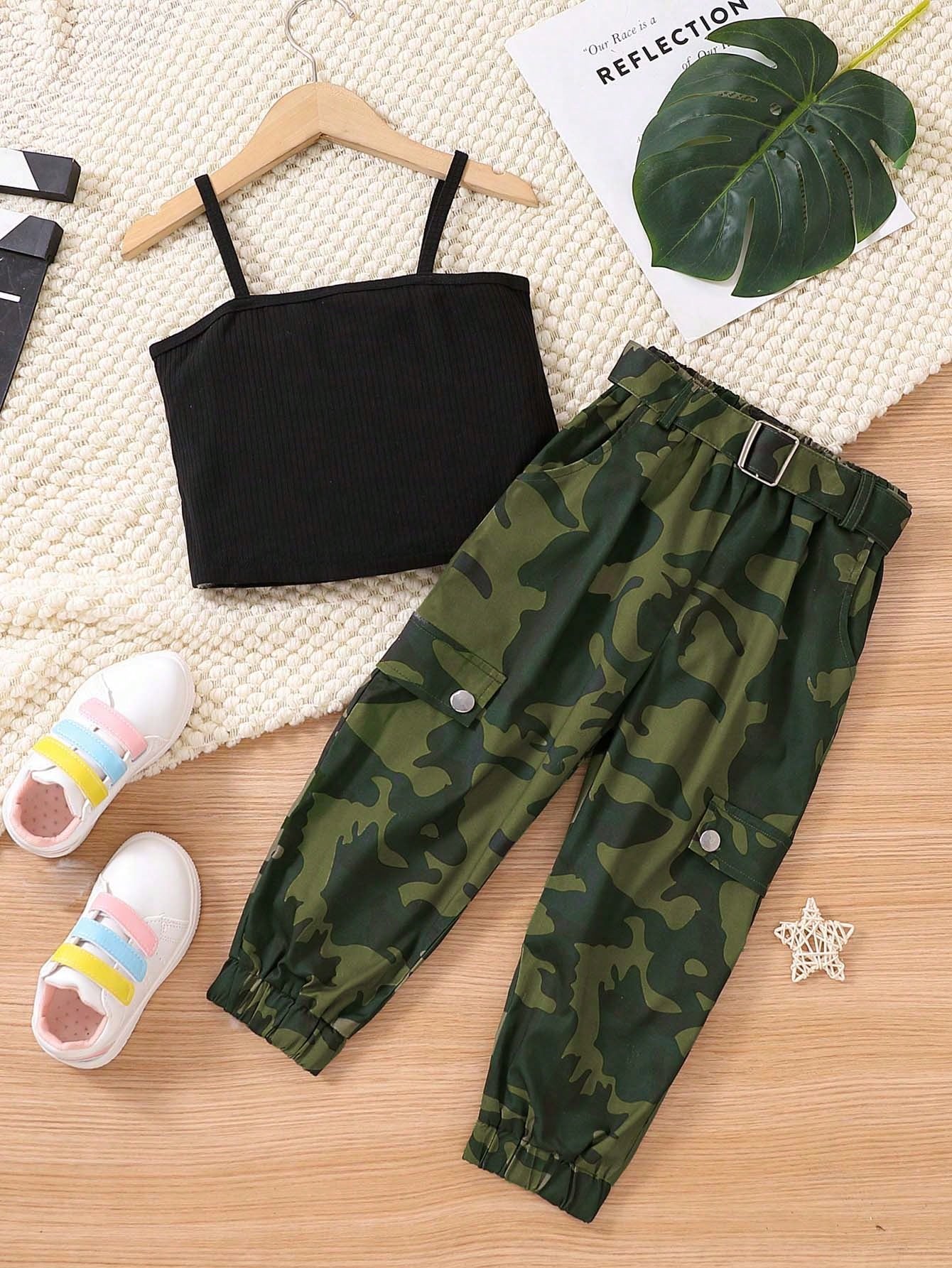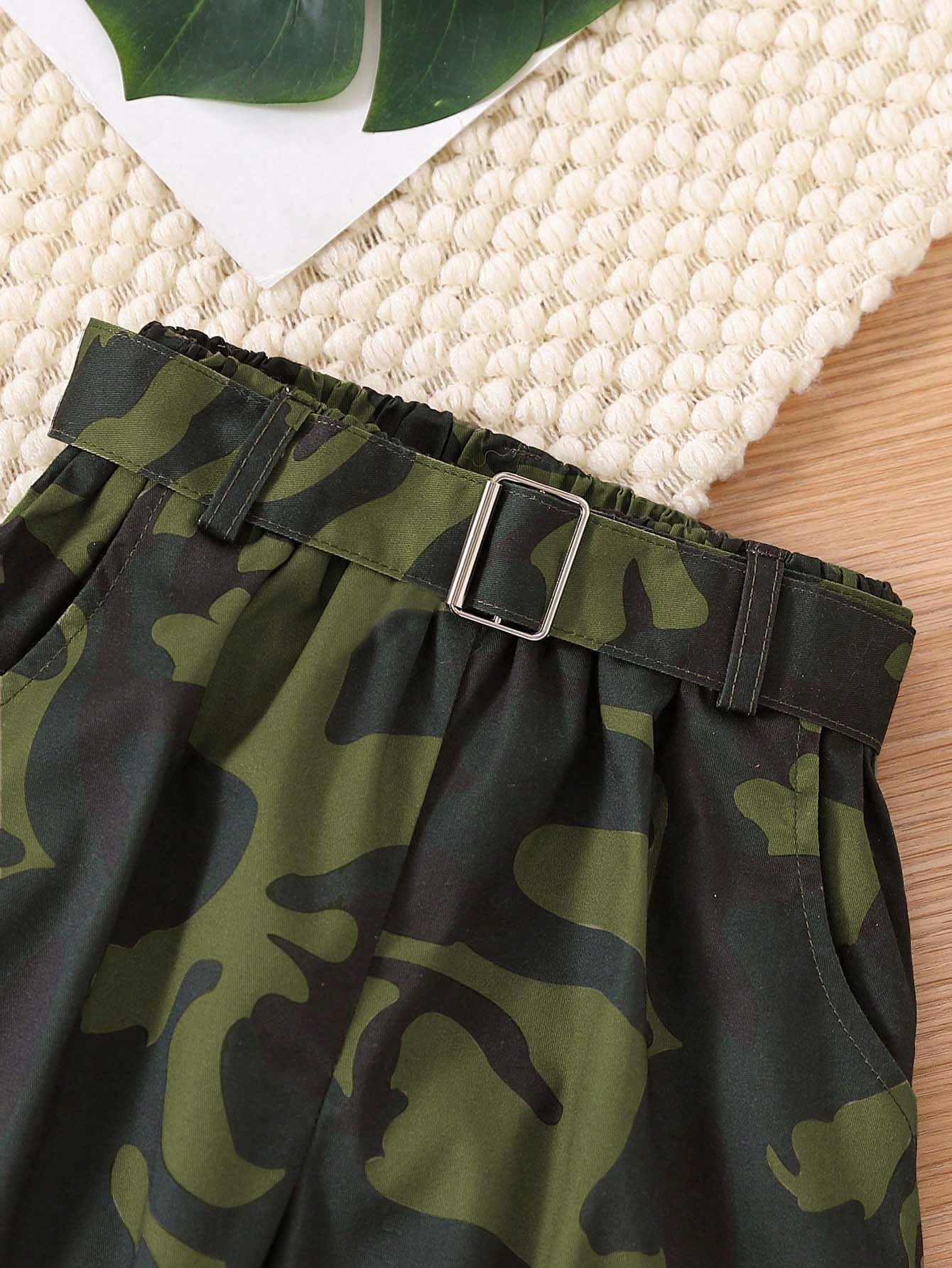 توب كامي وبنطلون كارجو بحزام وطباعة كامو طفلة صغيرة
