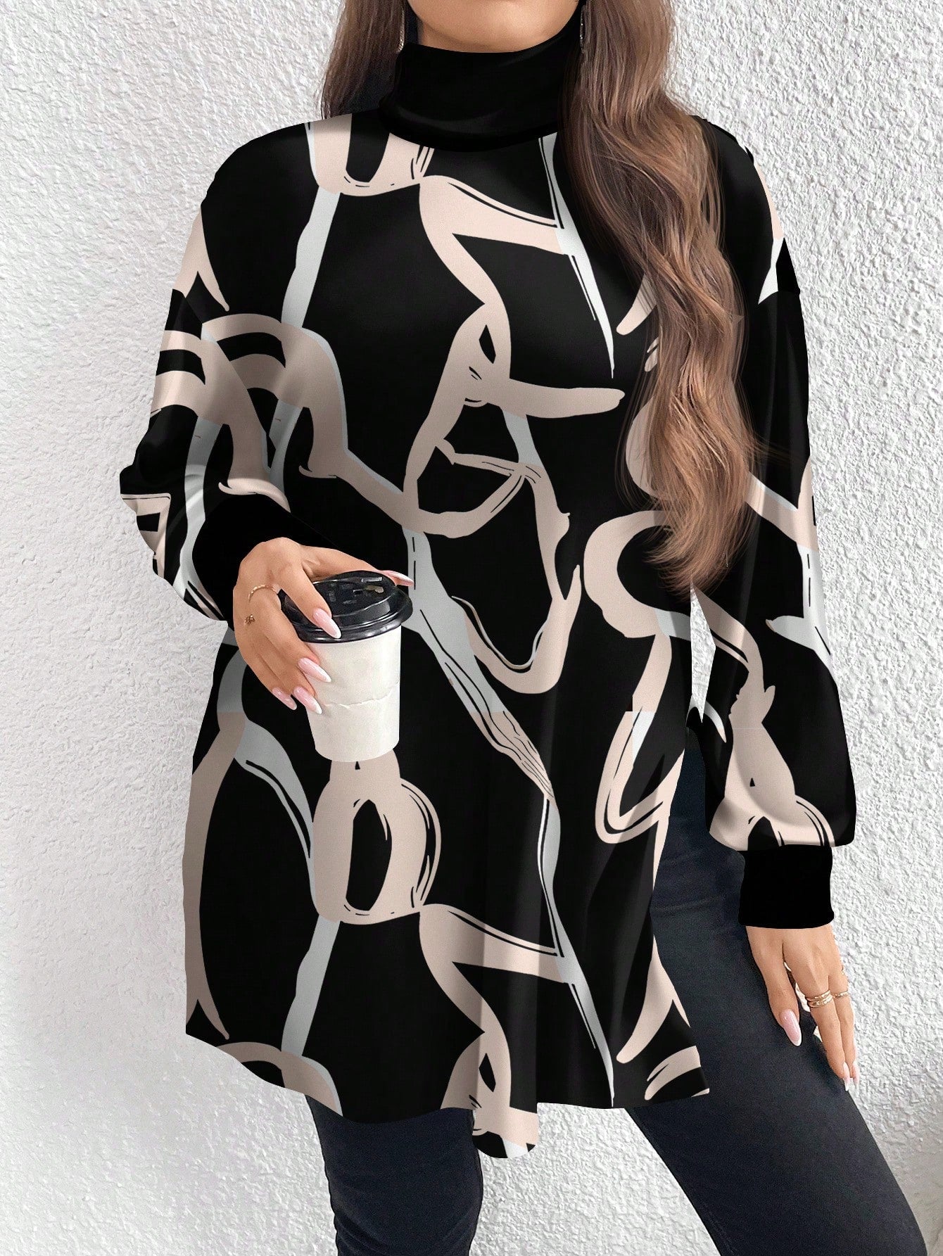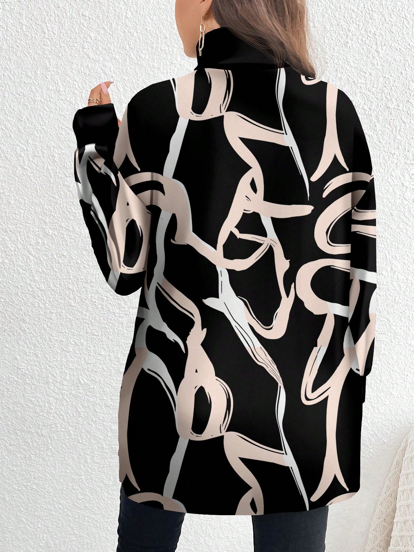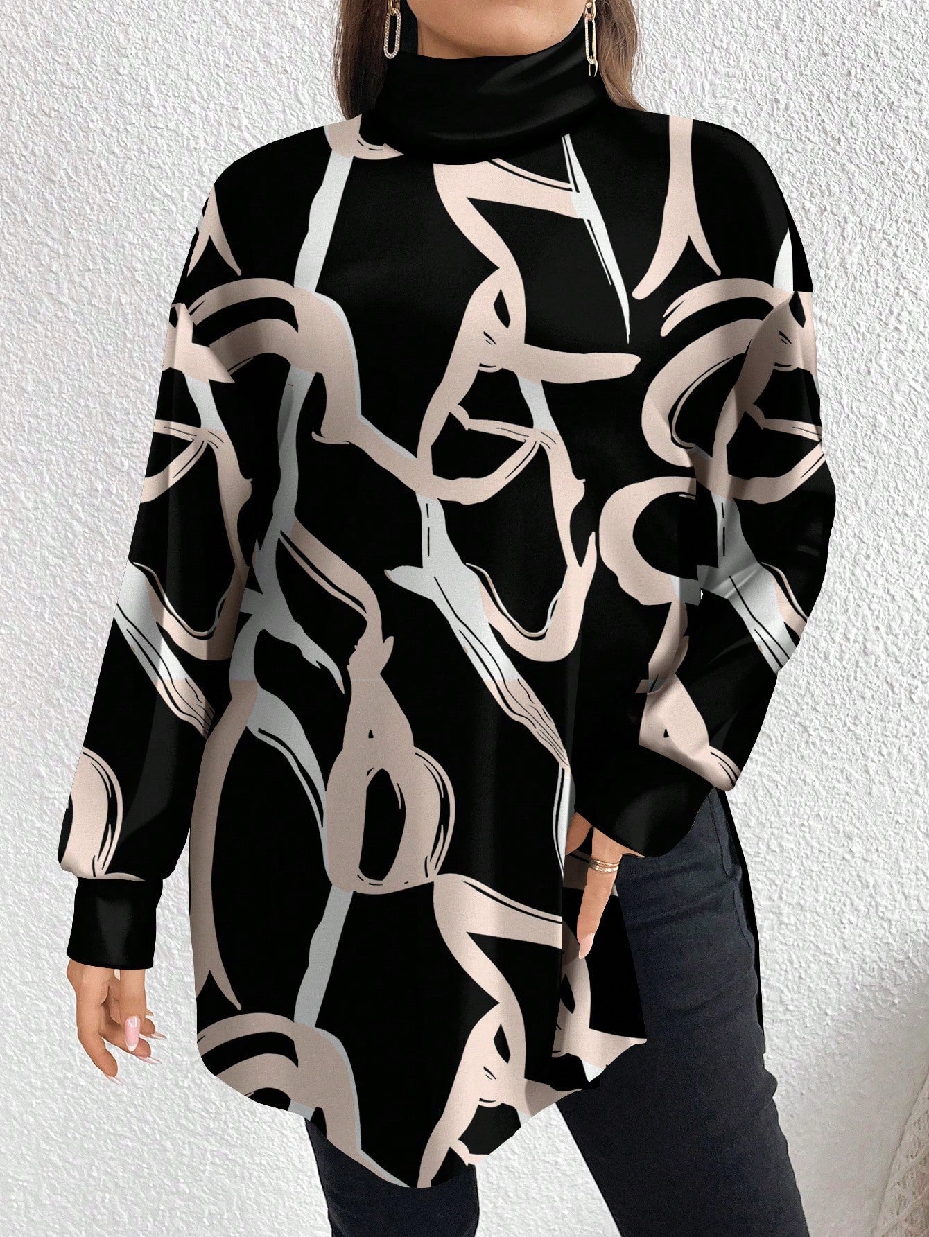 تيشيرت طويل بياقة محاكة مطبوع بنقوش ألوان مميزة