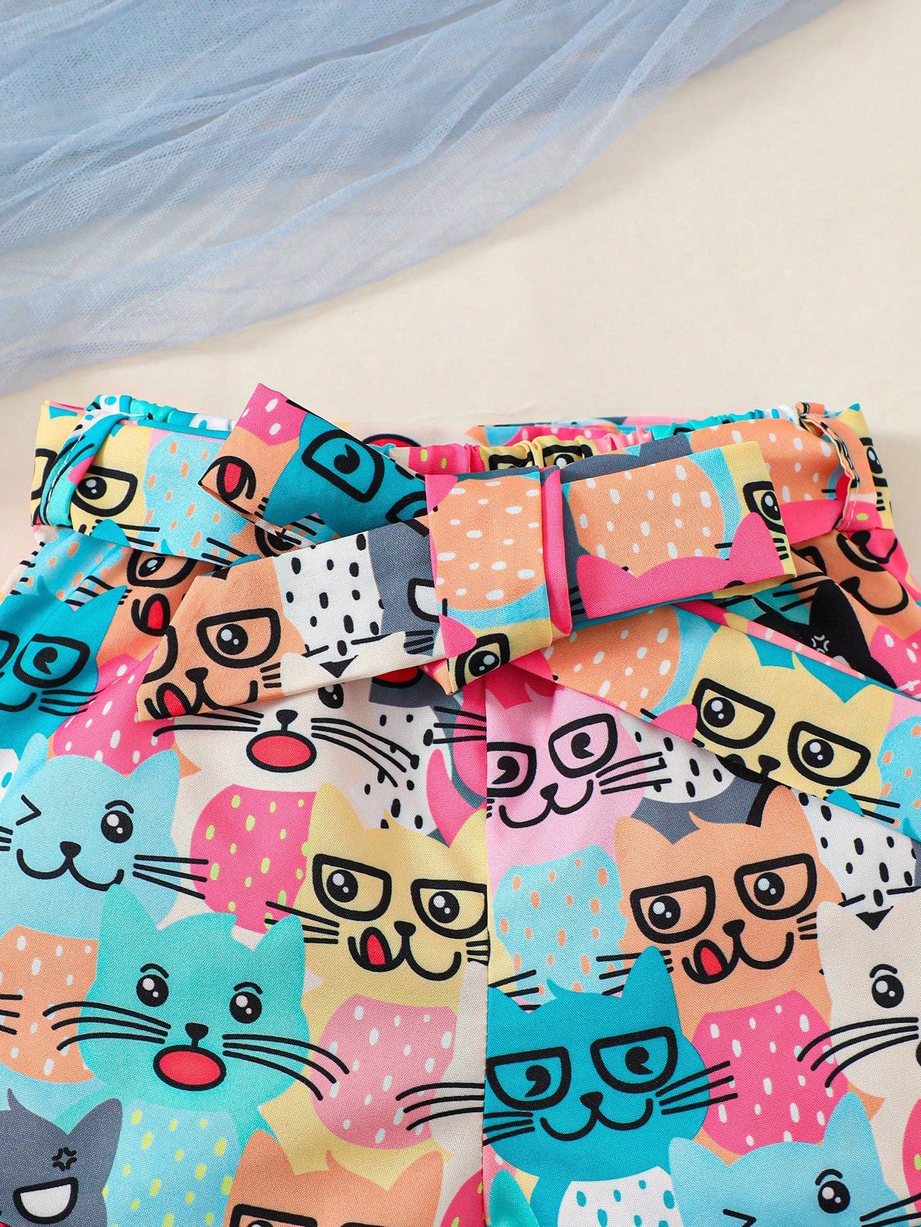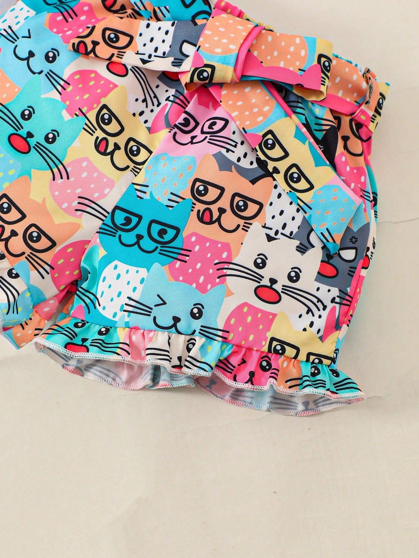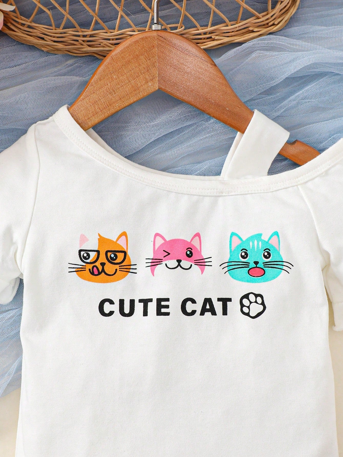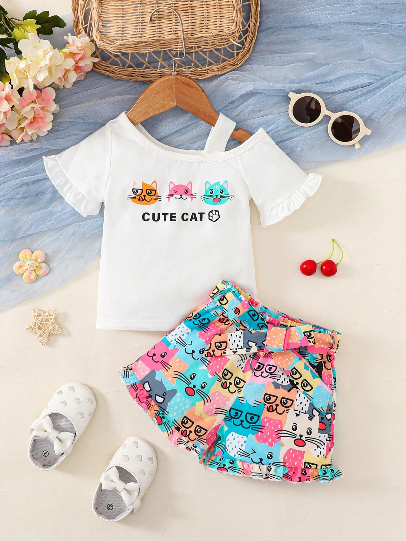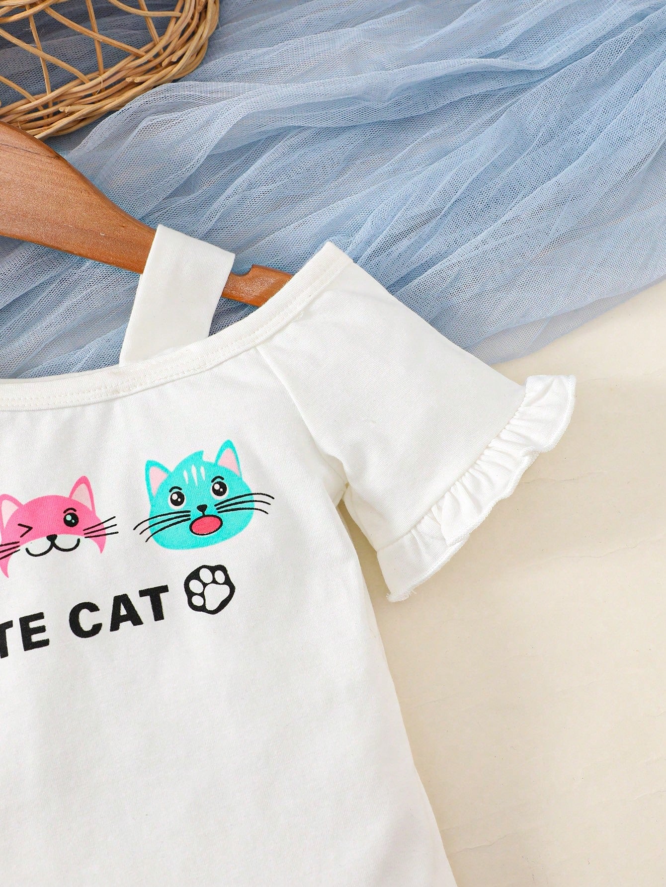 تيشيرت وسروال قصير بأكمام واسعة ورقبة غير متماثلة ورسومات كرتونية للأطفال