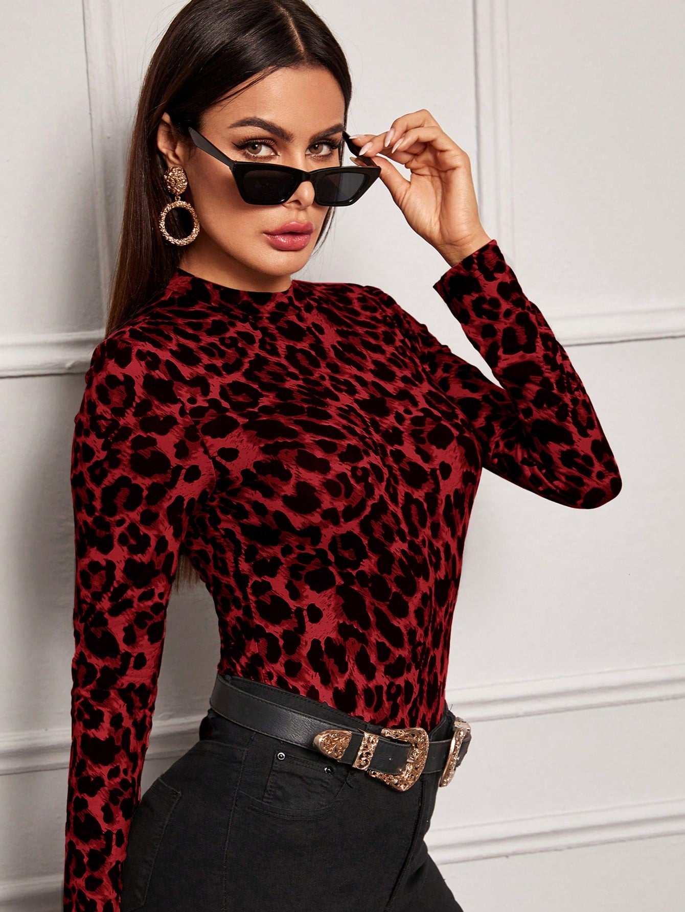 تي شيرت تريكو بأكمام طويلة مطابق للسيدات بياقة بولو وطباعة نمر لربيع/صيف